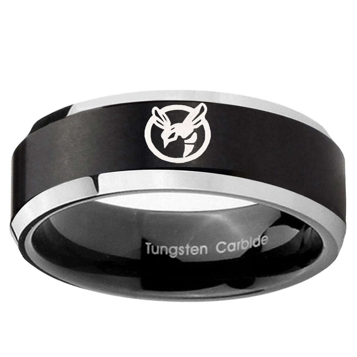 Intruding 5, 8mm Honey Bee Beveled Edges Brush Black 2 Tone Tungsten Custom Mens Ring . Offer in both 5mm and 8mm band width brushed black plated 2 tone finished from size 4 to 14