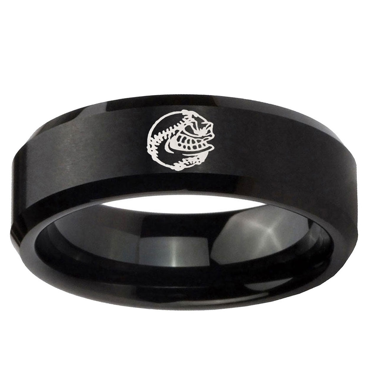 Intruding 5, 8mm Angry Baseball Beveled Edges Brush Black Tungsten Carbide Mens Wedding Ring . Offer in both 5mm and 8mm band width brushed black plated finished from size 4 to 14