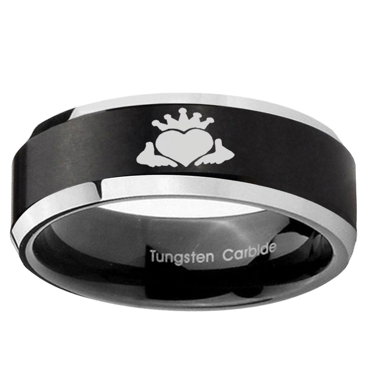 10mm Claddagh Design Beveled Brush Black 2 Tone Tungsten Wedding Engagement Ring