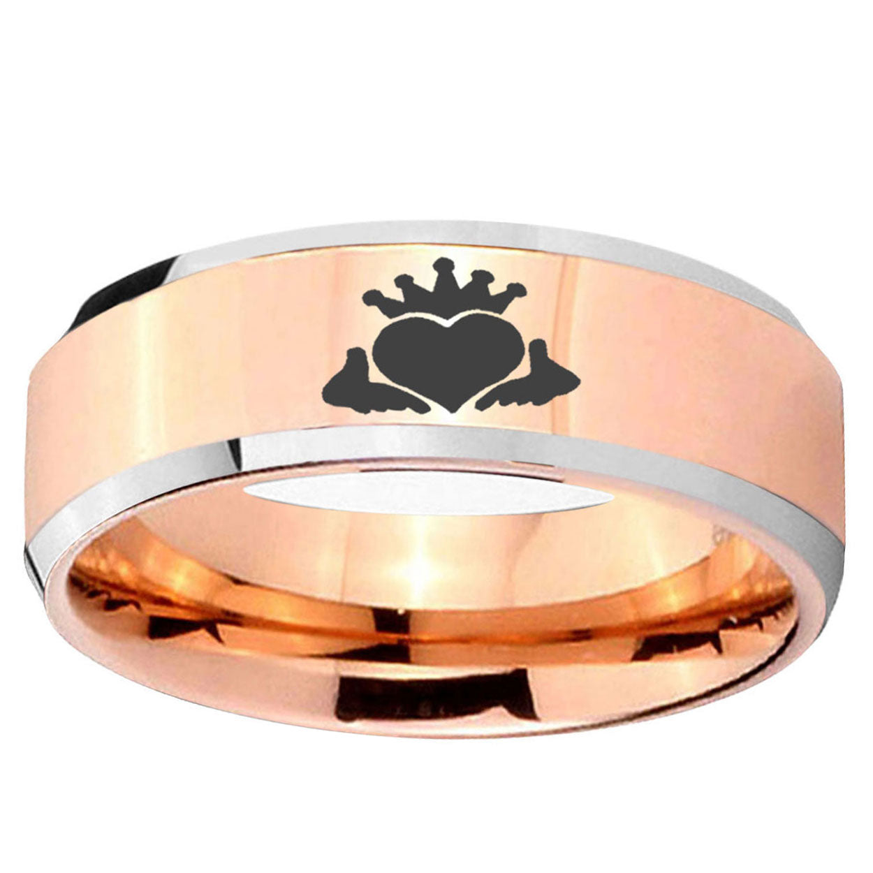 10mm Claddagh Design Beveled Edges Rose Gold Tungsten Mens Engagement Band
