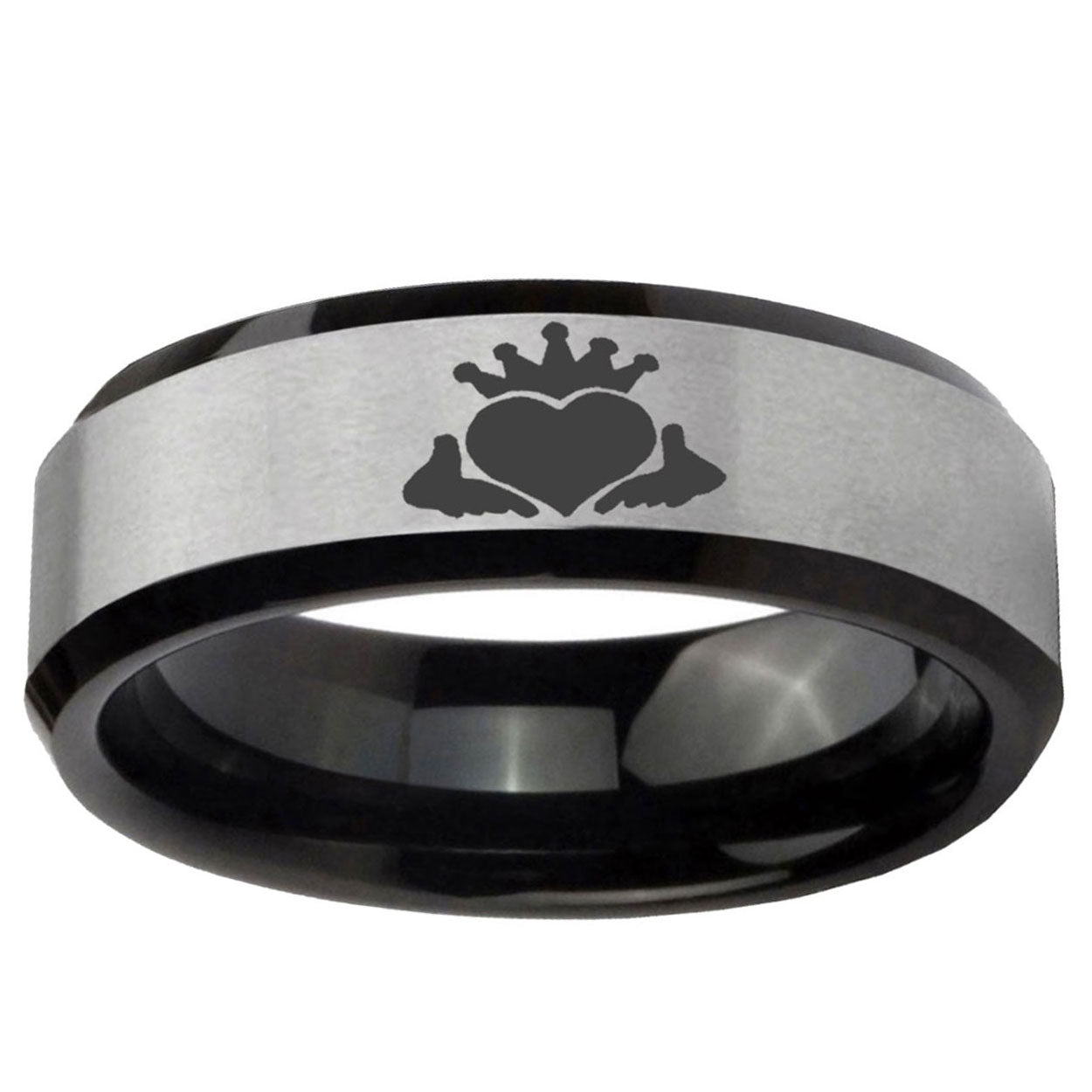 Propose with the 10mm Claddagh Design Beveled Brushed Silver Black Tungsten Men's Engagement Ring. This silver and black tungsten ring with Claddagh design is ideal for engagements.