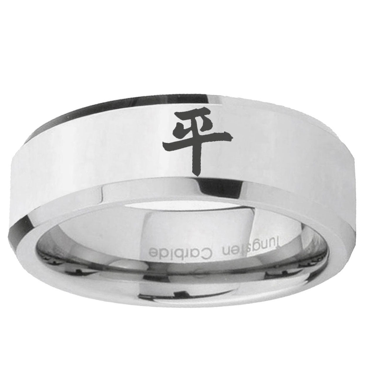 10mm Kanji Peace Beveled Edges Silver Tungsten Carbide Custom Mens Ring