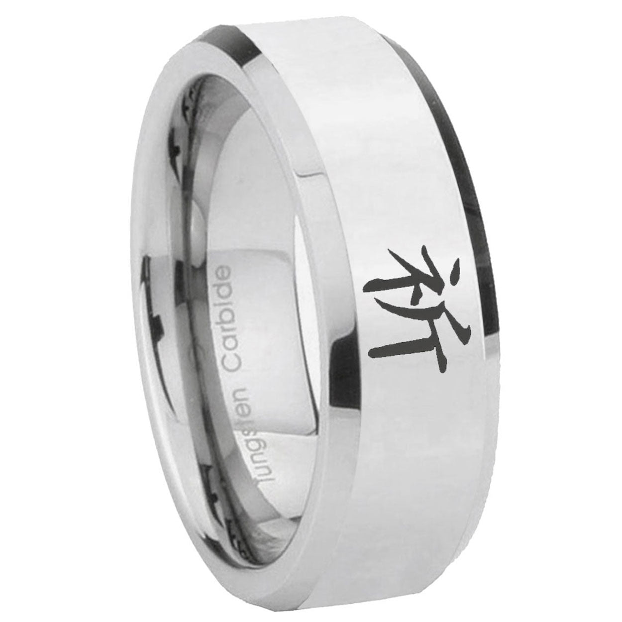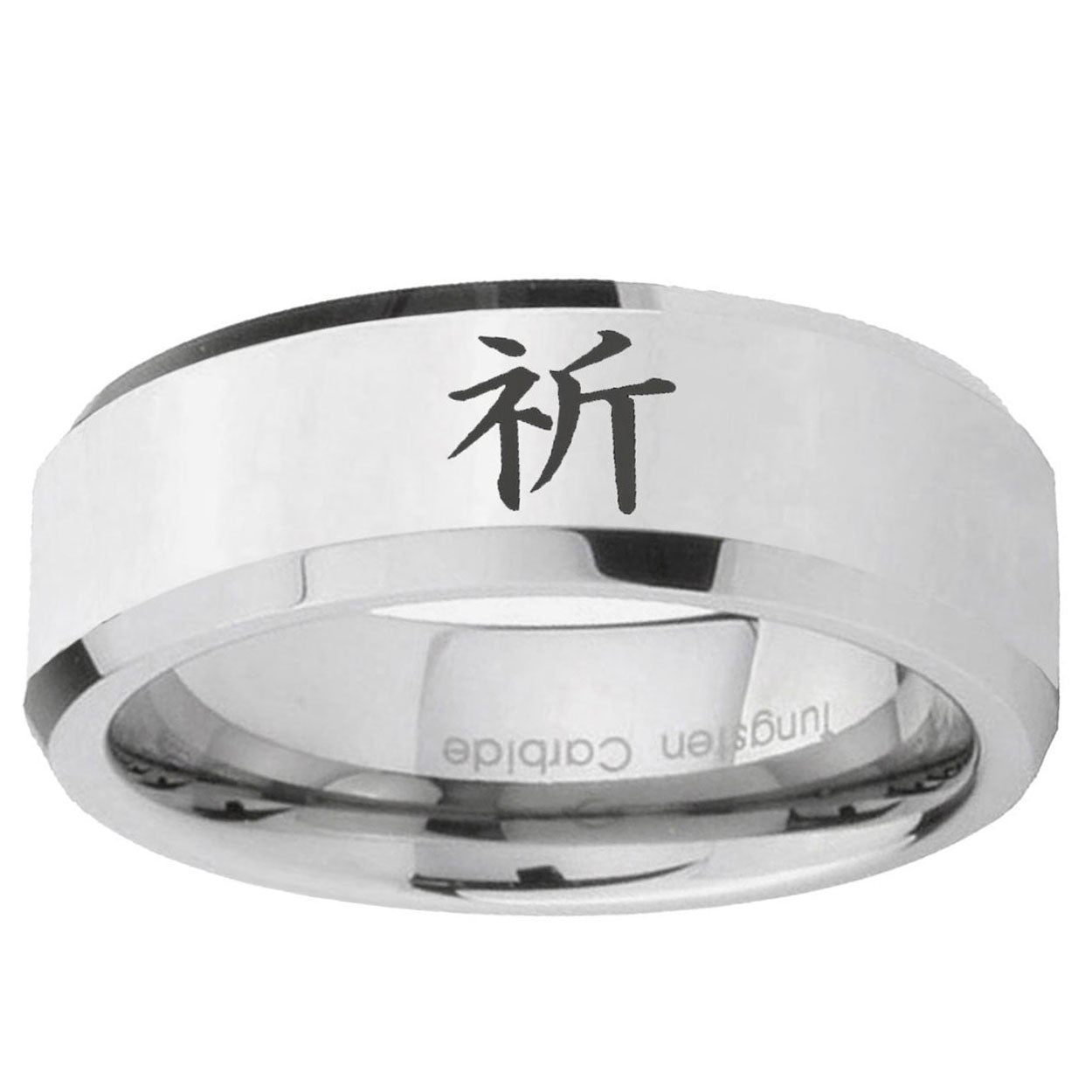 Intruding 5, 8mm Kanji Prayer Beveled Edges Silver Tungsten Carbide Mens Anniversary Ring . Offer in both 5mm and 8mm band width polished silver finished from size 4 to 14