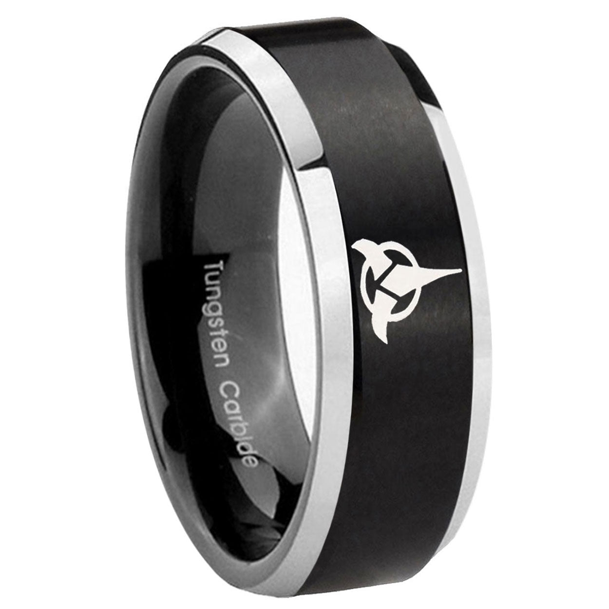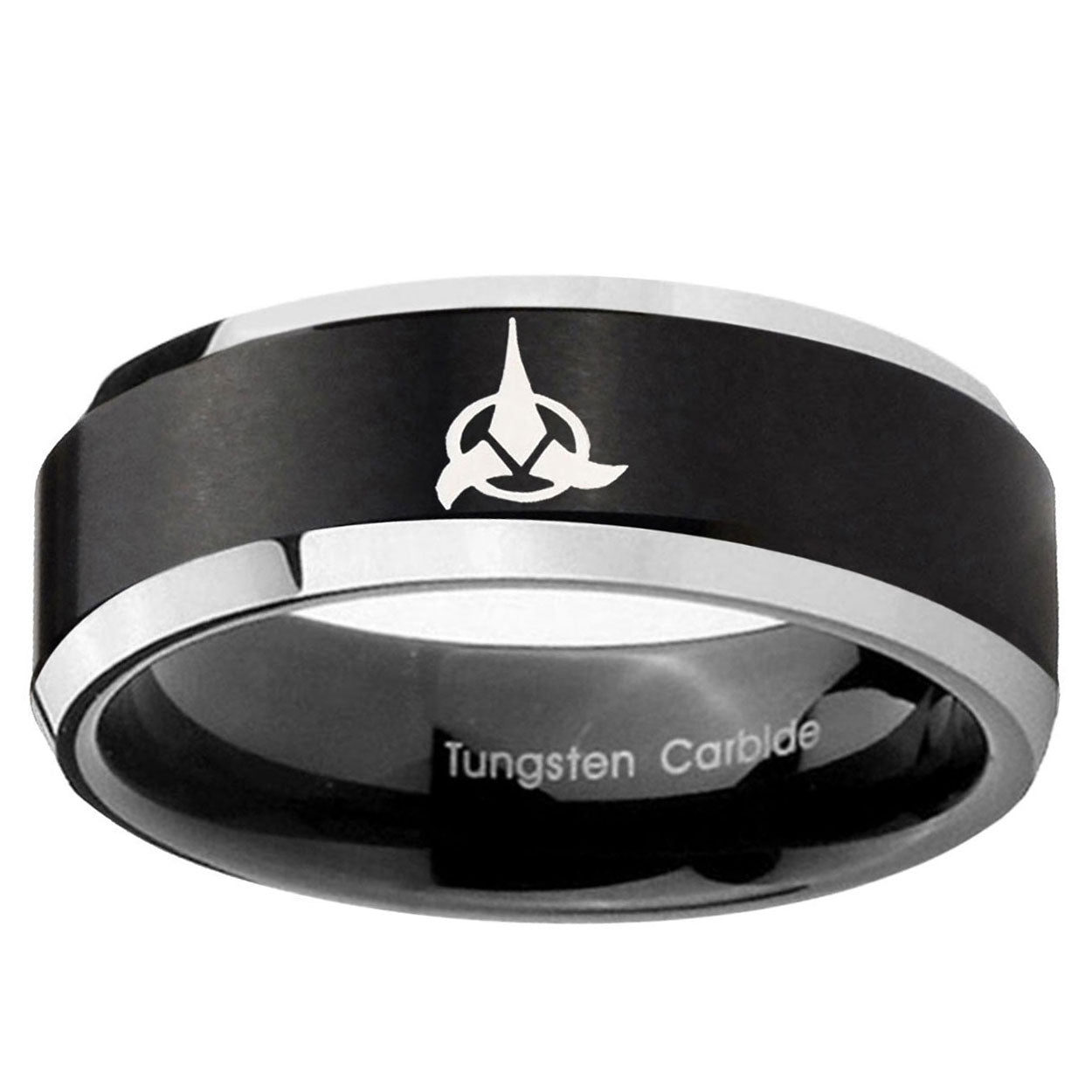 Intruding 5, 8mm Klingon Beveled Edges Brush Black 2 Tone Tungsten Men's Engagement Band . Offer in both 5mm and 8mm band width brushed black plated 2 tone finished from size 4 to 14