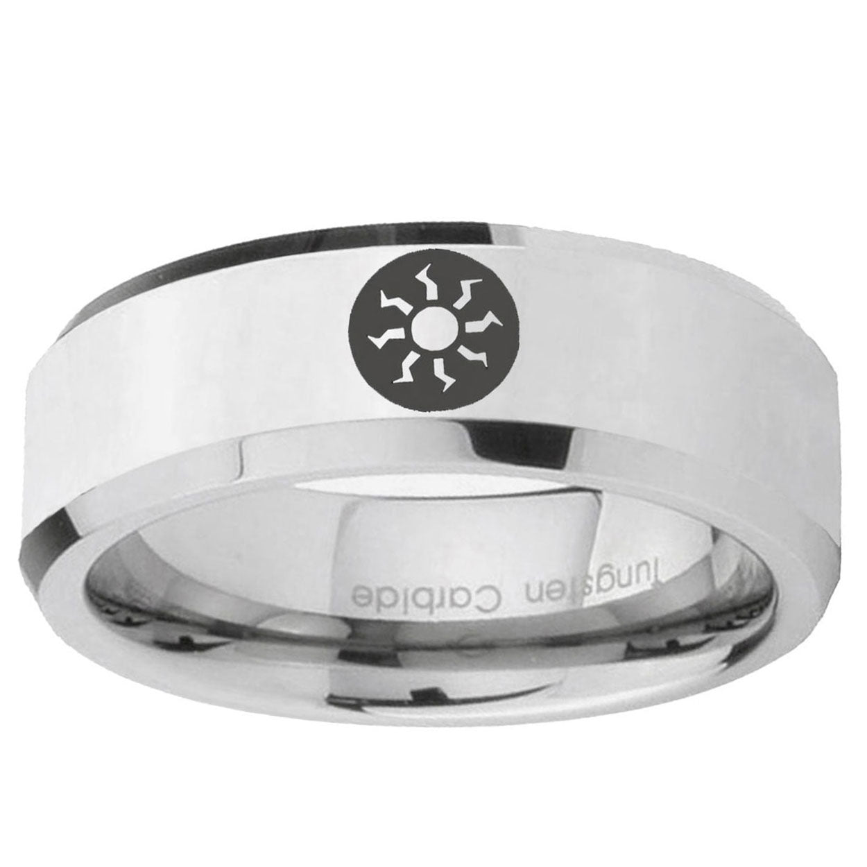 Intruding 5, 8mm Magic The Gathering Beveled Edges Silver Tungsten Men's Promise Rings . Offer in both 5mm and 8mm band width polished silver finished from size 4 to 14