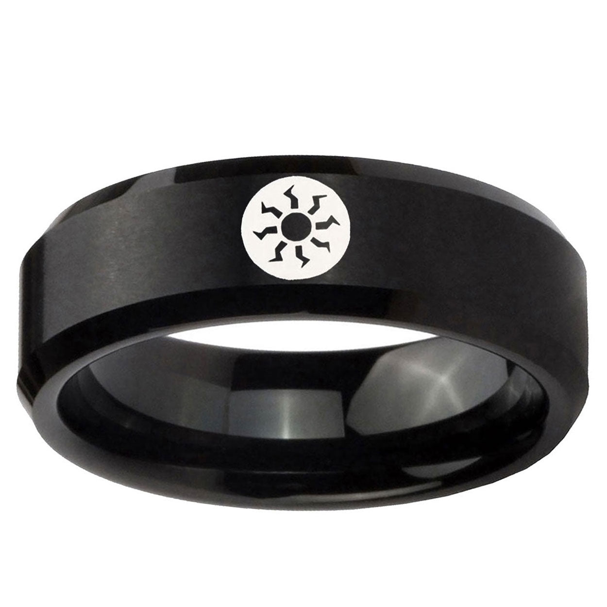 Intruding 5, 8mm Magic The Gathering Beveled Brush Black Tungsten Wedding Engagement Ring . Offer in both 5mm and 8mm band width brushed black plated finished from size 4 to 14