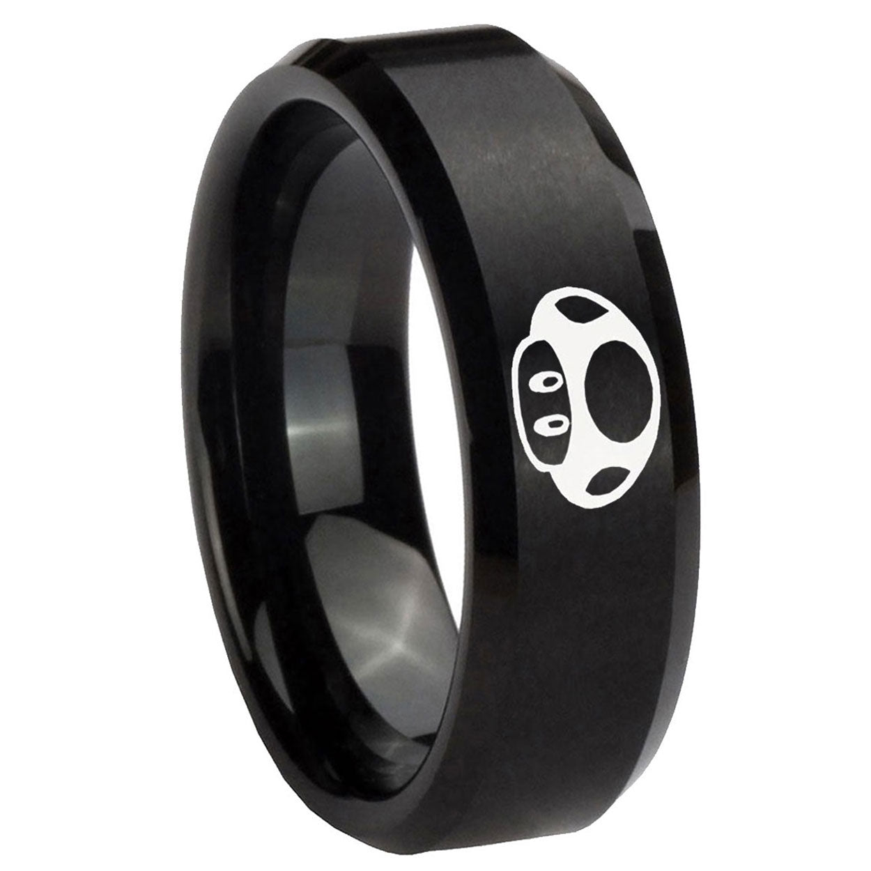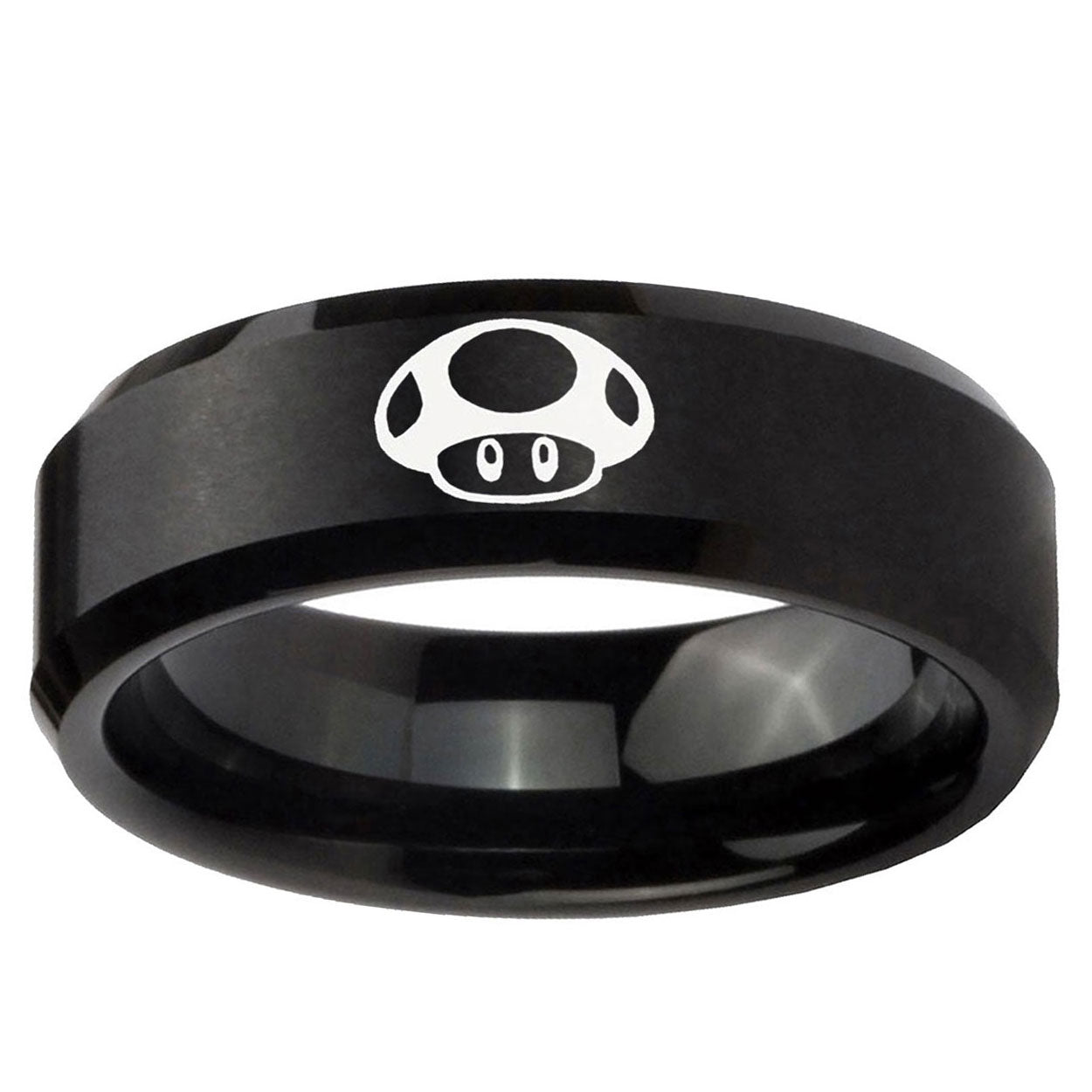 Intruding 5, 8mm Mario Mushroom Beveled Edges Brush Black Tungsten Carbide Bands Ring . Offer in both 5mm and 8mm band width brushed black plated finished from size 4 to 14