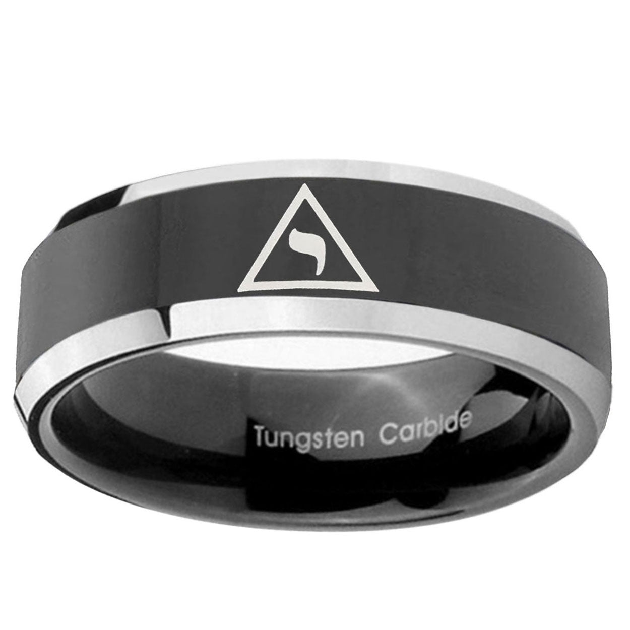 Style the 10mm Masonic Yod Beveled Edges Glossy Black 2 Tone Tungsten Rings for Men. This glossy black and 2-tone tungsten ring with Masonic Yod design is perfect for men.