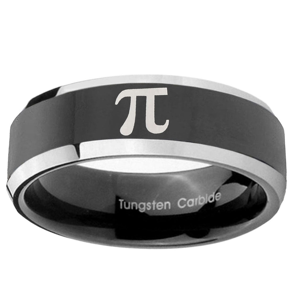 Intruding 5, 8mm Math Pi Beveled Edges Glossy Black 2 Tone Tungsten Carbide Mens Bands Ring . Offer in both 5mm and 8mm band width shiny black pated two tone finished from size 4 to 14