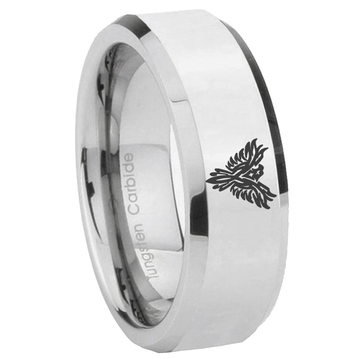Intruding 5, 8mm Phoenix Beveled Edges Silver Tungsten Carbide Men's Engagement Band . Offer in both 5mm and 8mm band width polished silver finished from size 4 to 14