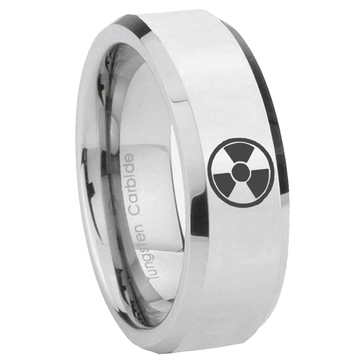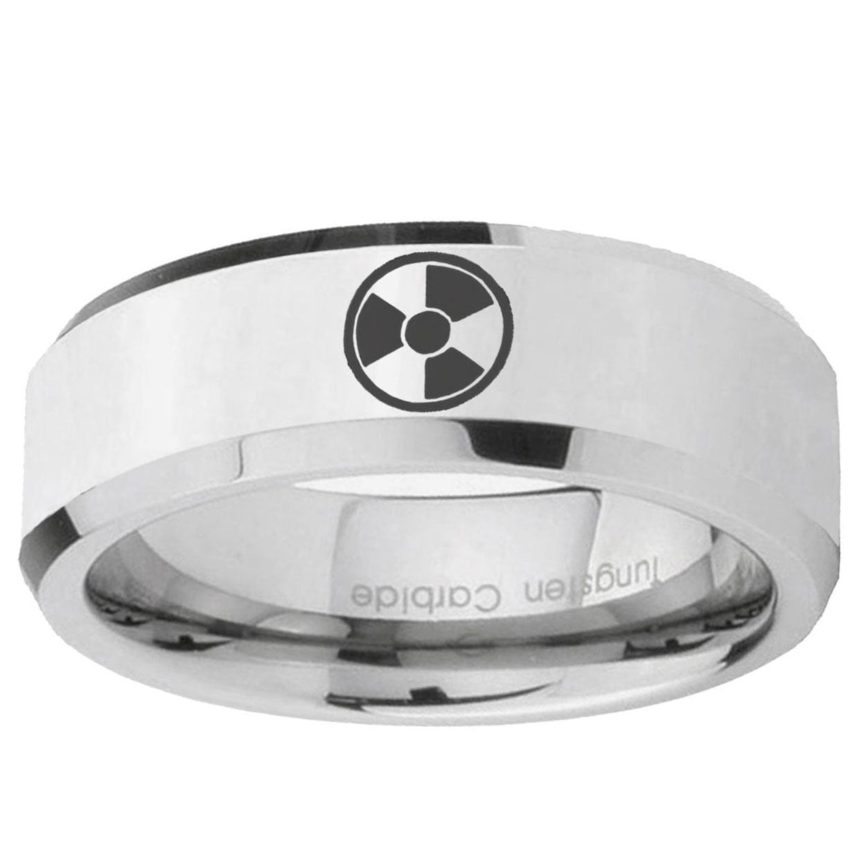 Intruding 5, 8mm Radiation Beveled Edges Silver Tungsten Carbide Mens Wedding Band . Offer in both 5mm and 8mm band width polished silver finished from size 4 to 14
