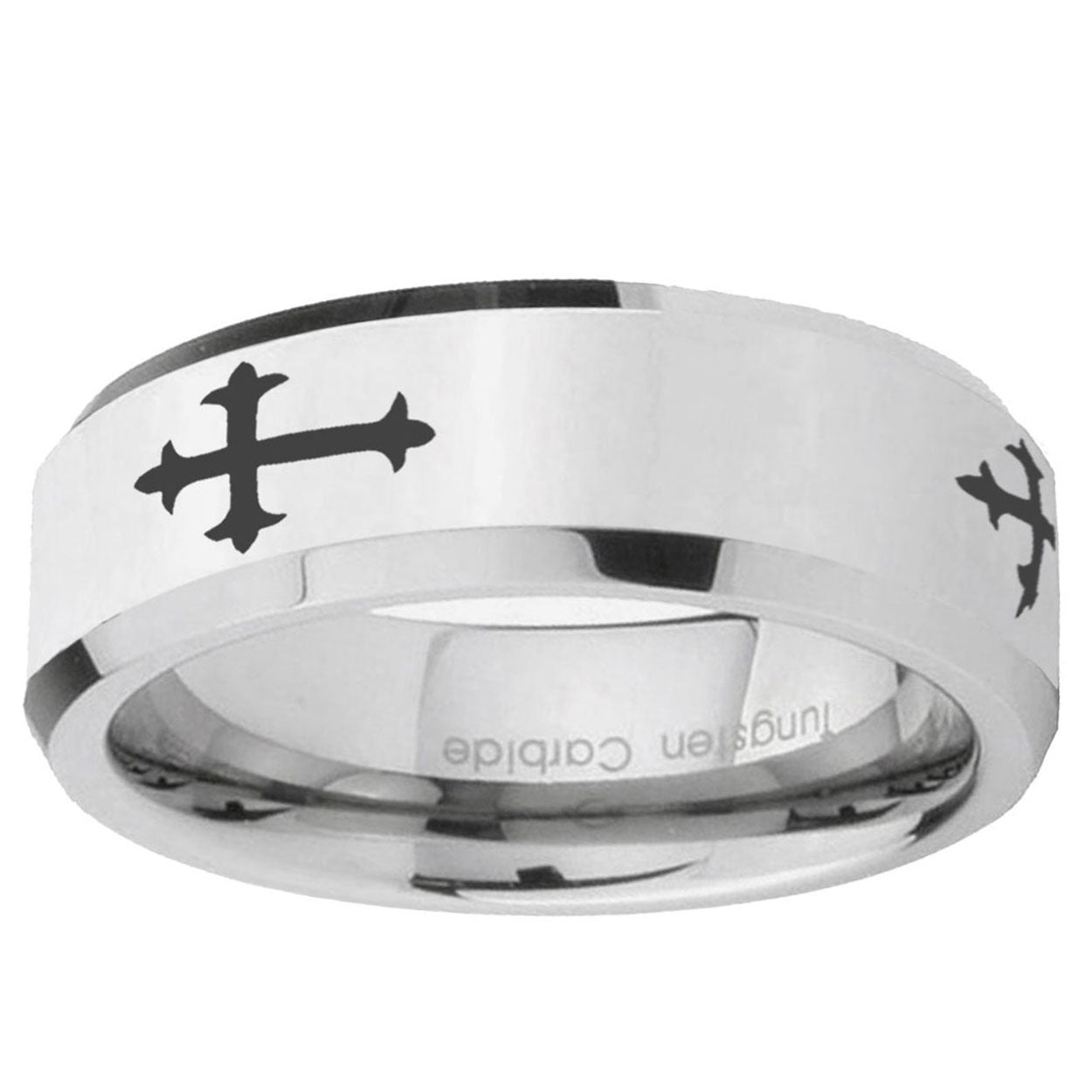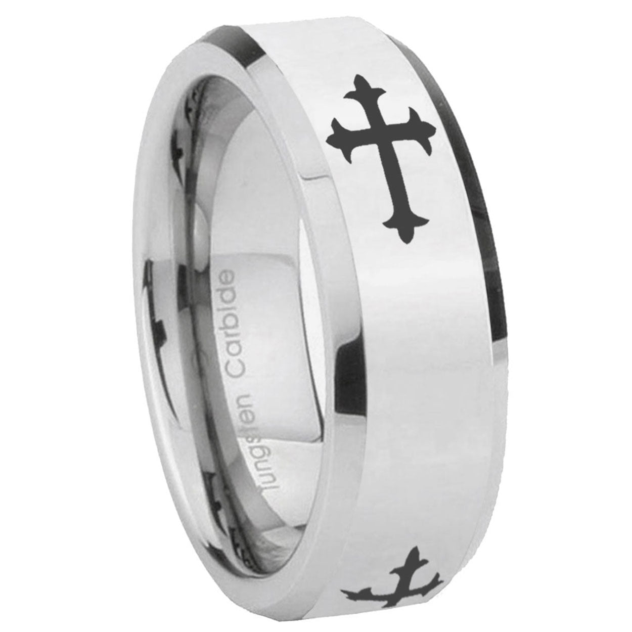 10mm Christian Cross Religious Beveled Edges Silver Tungsten Carbide Mens Ring Engraved