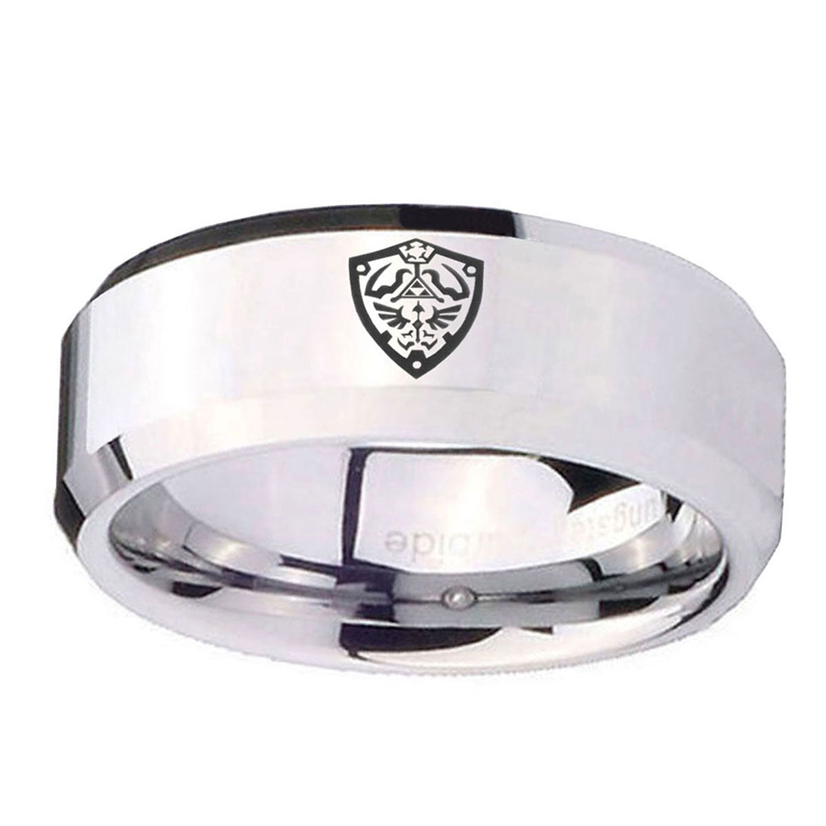 Celebrate with the 10mm Zelda Hylian Shield Beveled Edges Silver Tungsten Wedding Band Mens. This silver tungsten ring with Zelda Hylian Shield design is perfect for weddings.