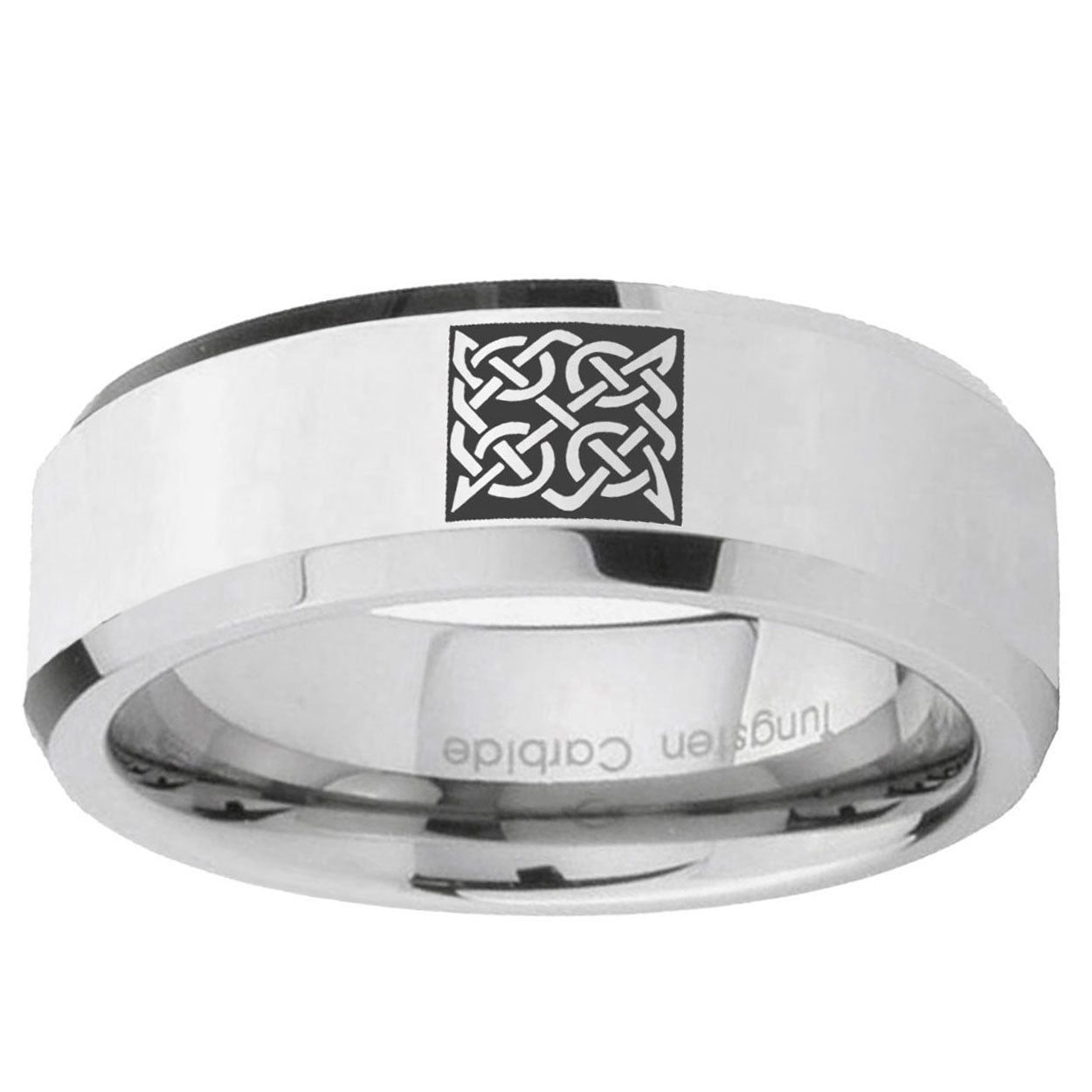 Intruding 5, 8mm Celtic Design Beveled Edges Silver Tungsten Carbide Men's Bands Ring . Offer in both 5mm and 8mm band width polished silver finished from size 4 to 14