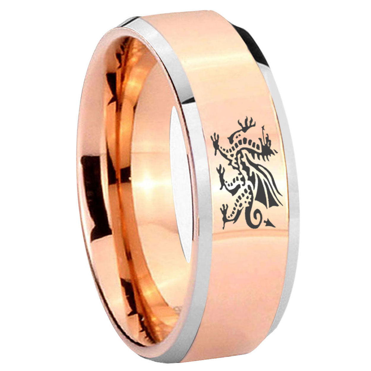 Intruding 5, 8mm Dragon Beveled Edges Rose Gold Tungsten Carbide Mens Engagement Band . Offer in both 5mm and 8mm band width rose gold two tone finished from size 4 to 14