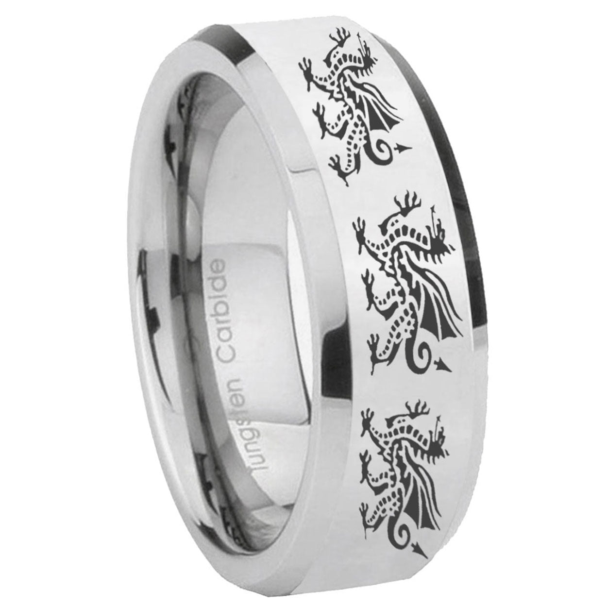 Personalize the 10mm Multiple Dragon Beveled Edges Silver Tungsten Carbide Mens Ring Engraved. This silver tungsten ring with Multiple Dragon design is perfect for custom engravings.