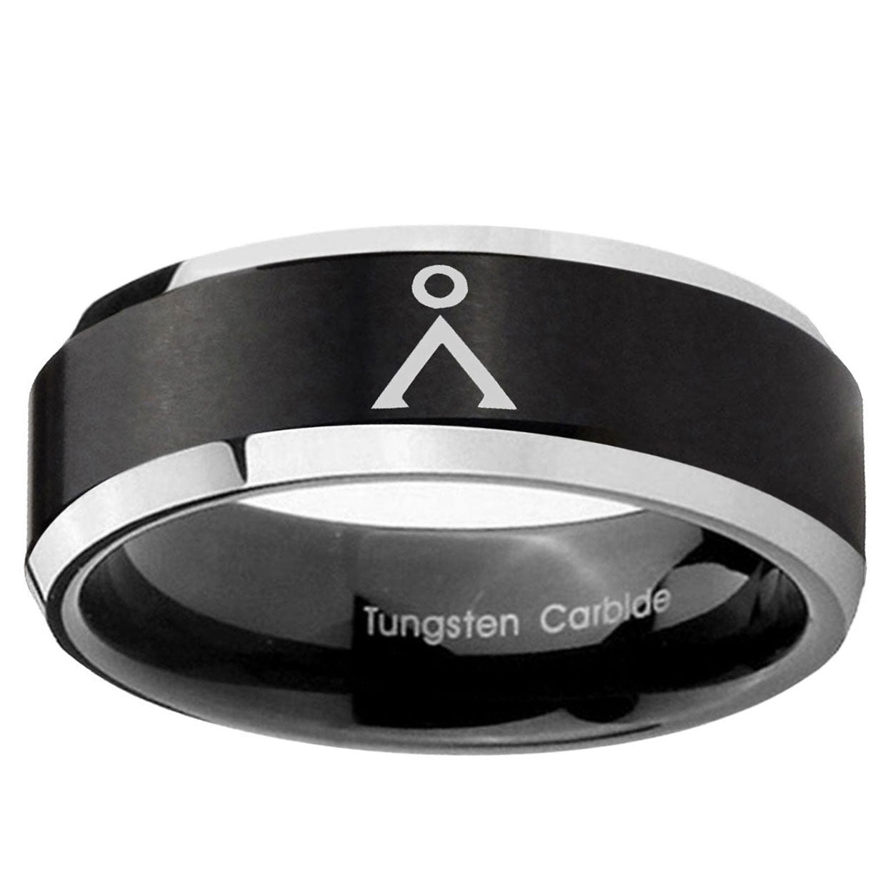 Intruding 5, 8mm Stargate Beveled Edges Brush Black 2 Tone Tungsten Carbide Mens Ring . Offer in both 5mm and 8mm band width brushed black plated 2 tone finished from size 4 to 14