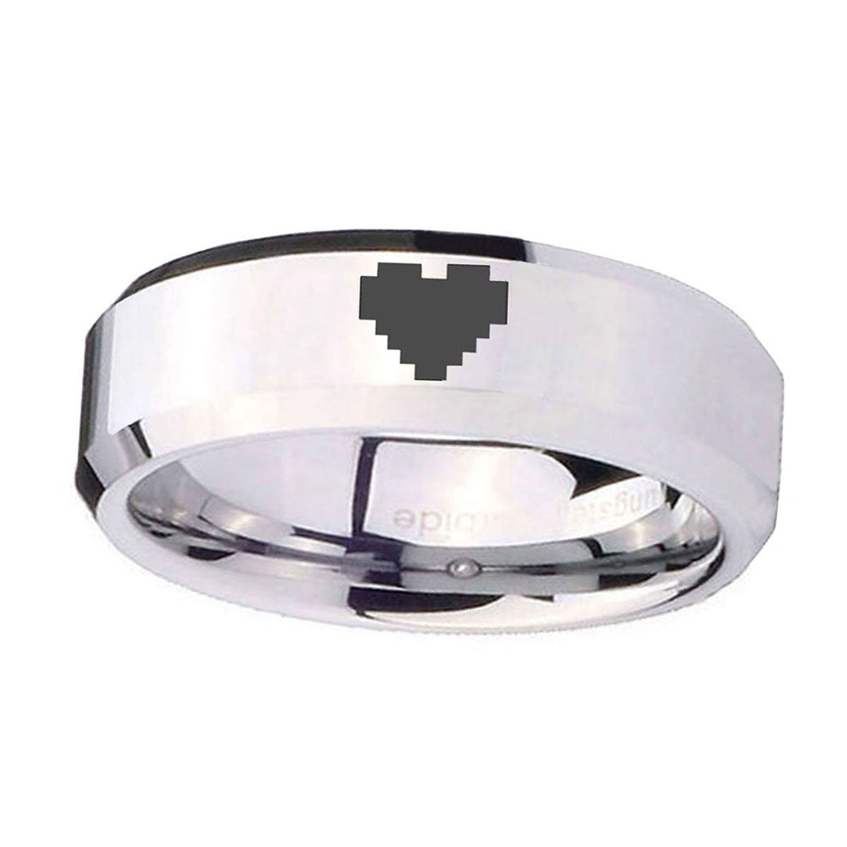 Introuding 5, 8mm Mirror Bevel Edges Zelda Heart Silver Tungsten Laser Engraved Ring . Offer in both 5mm and 8mm band width polished silver fnished from size 4 to 14