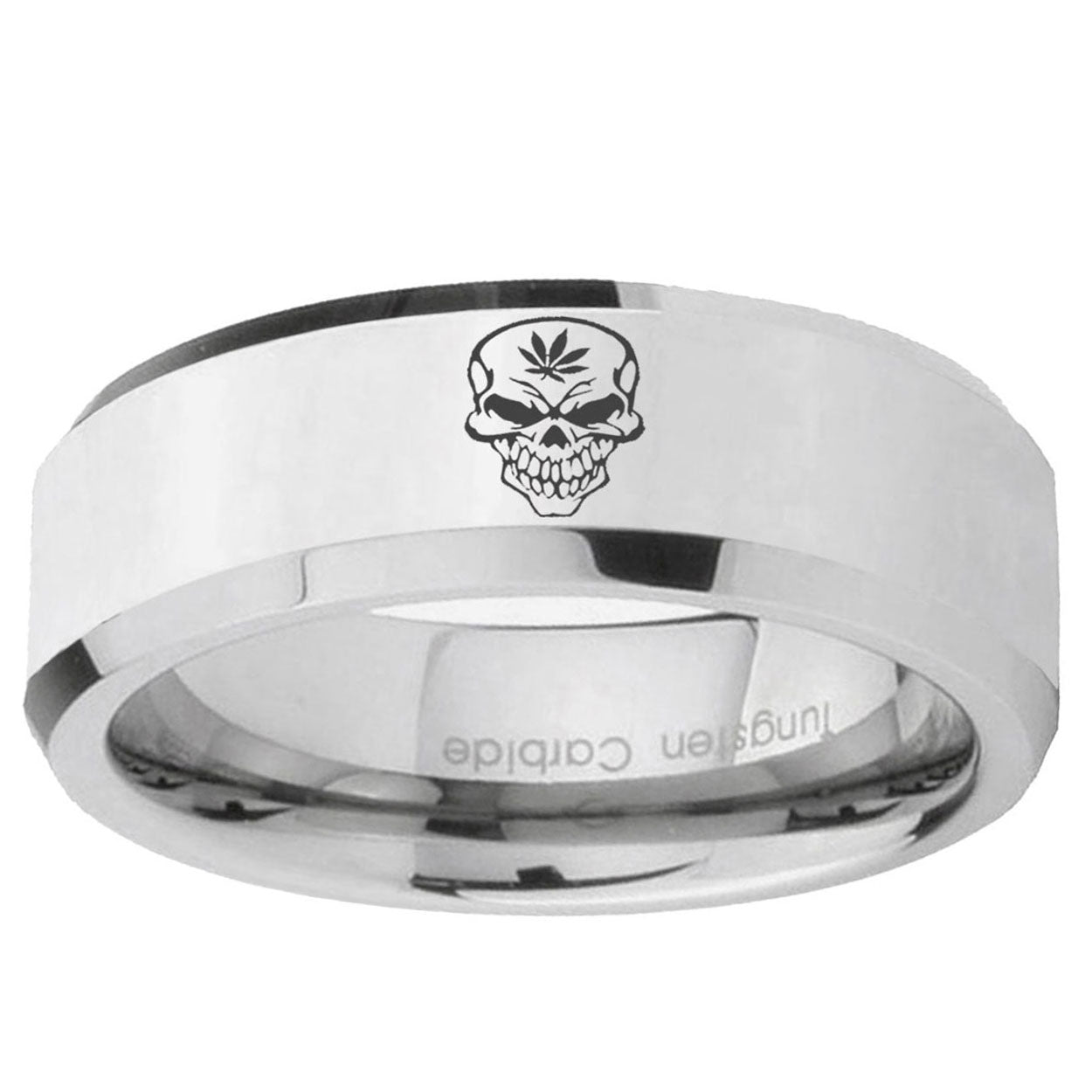 Intruding 5, 8mm Skull Marijuana Leaf Beveled Edges Silver Tungsten Carbide Engraved Ring . Offer in both 5mm and 8mm band width polished silver finished from size 4 to 14