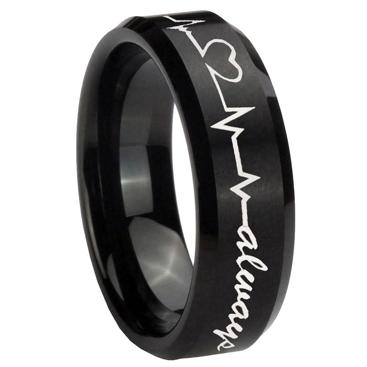 Personalize the 10mm Heart Beat forever Heart always Beveled Brush Black Tungsten Engraved Ring. This brushed black tungsten ring with Heart Beat design is perfect for custom engravings.