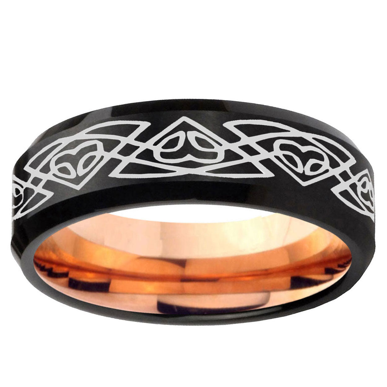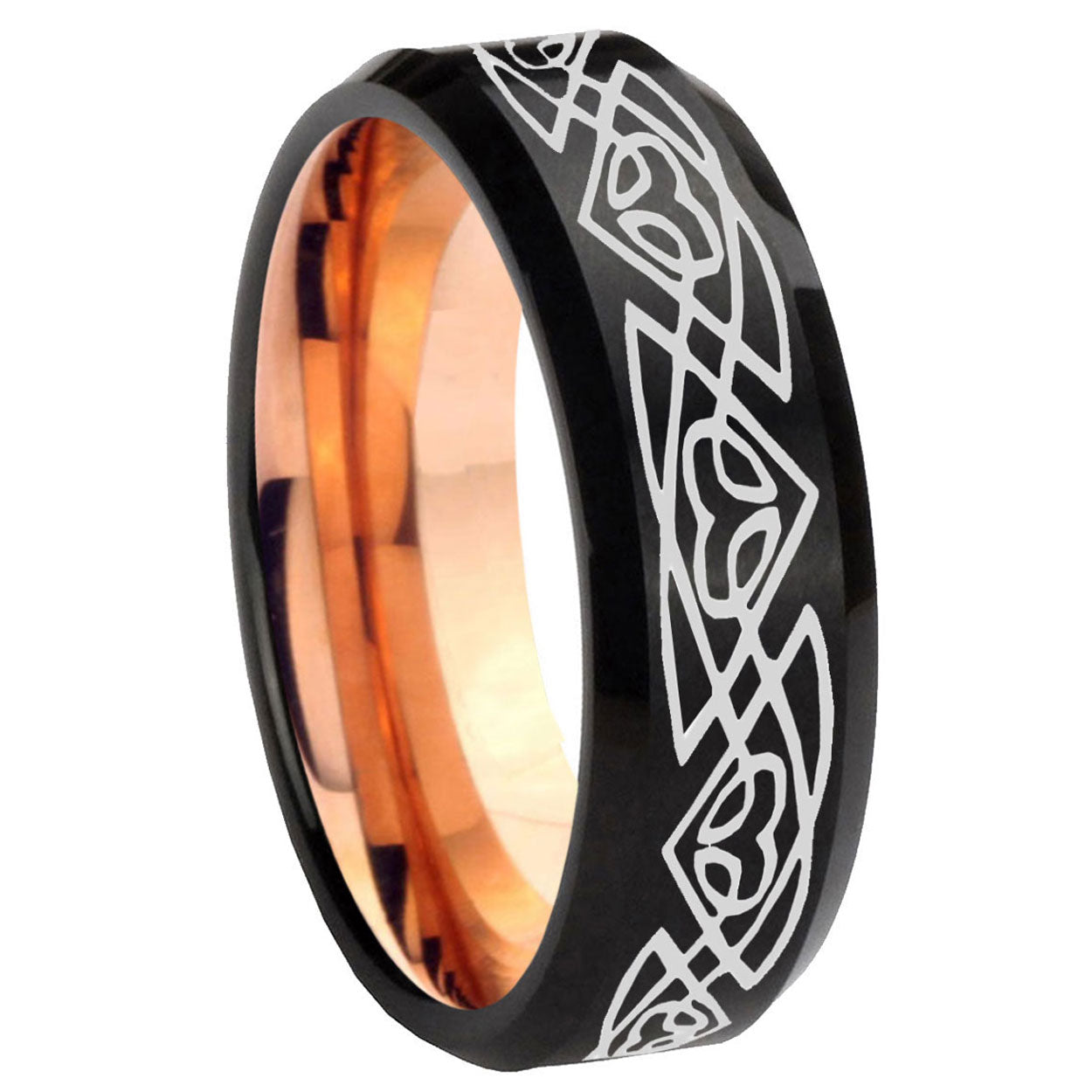 Add elegance with the 10mm Celtic Braided Bevel Tungsten Rose Gold Mens Wedding Band. This rose gold tungsten ring with Celtic braided design is ideal for weddings.