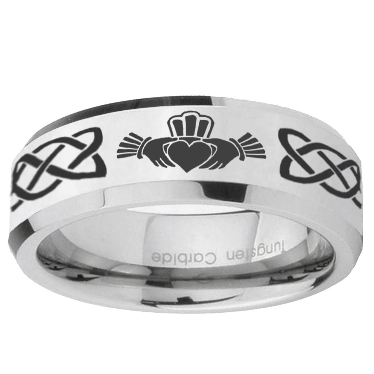 Style the 10mm Irish Claddagh Beveled Edges Silver Tungsten Carbide Bands Ring. This silver tungsten ring with Irish Claddagh design is perfect for men.