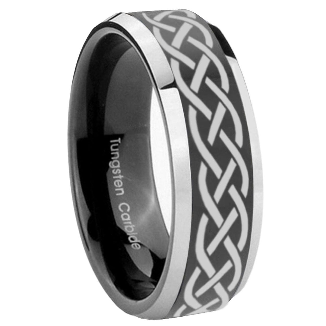 Propose with the 10mm Celtic Knot Beveled Glossy Black 2 Tone Tungsten Engagement Ring. This glossy black and 2-tone tungsten ring with Celtic knot design is ideal for engagements.