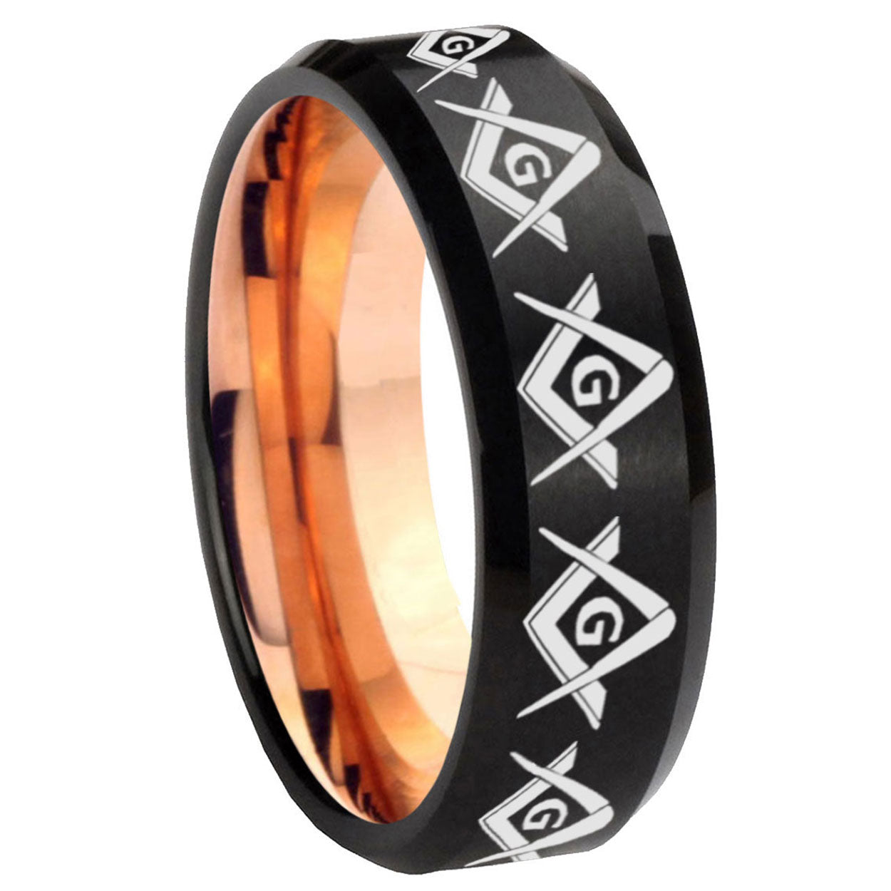 Celebrate with the 10mm Masonic Square and Compass Bevel Tungsten Rose Gold Mens Wedding Band. This rose gold tungsten ring with Masonic Square and Compass design is perfect for weddings.