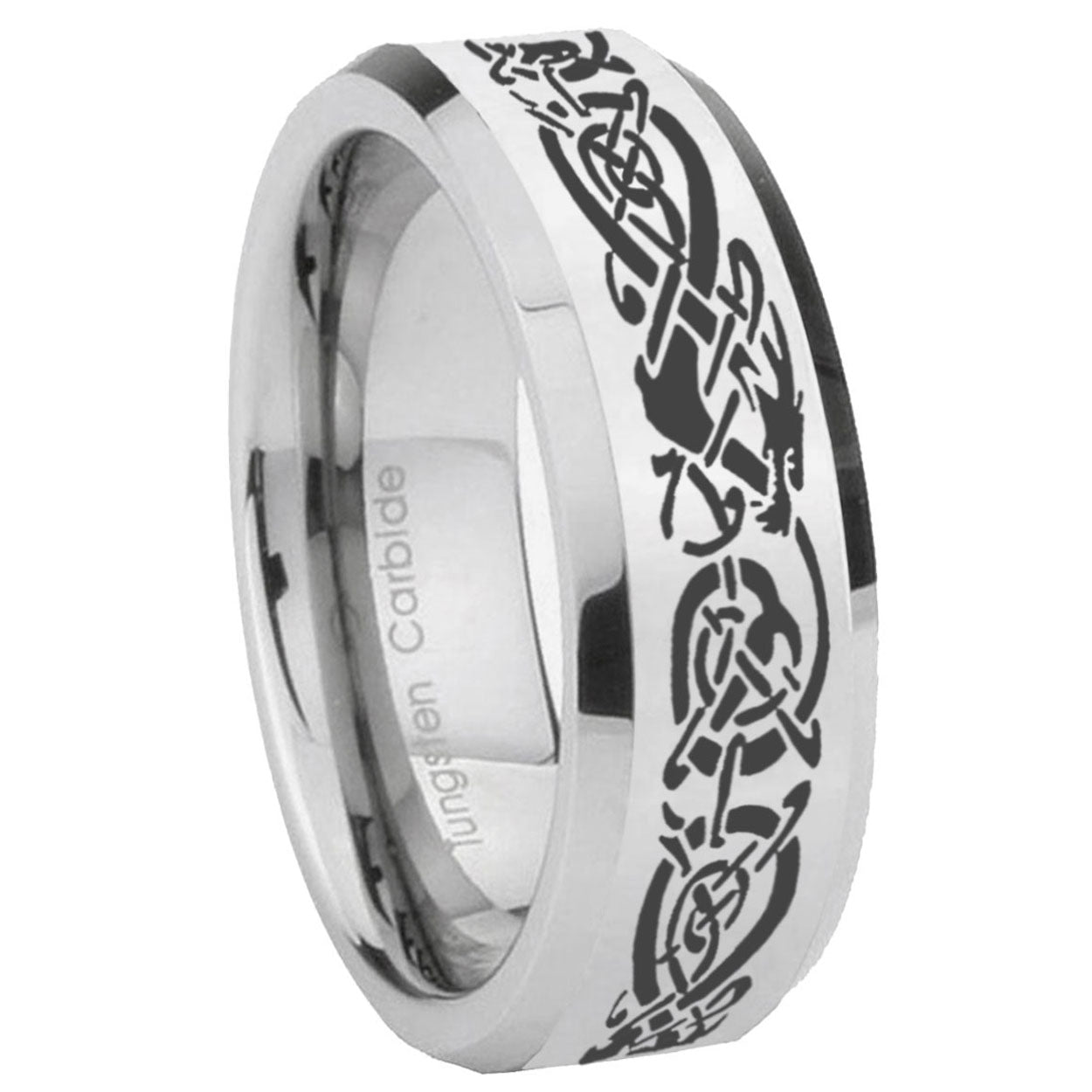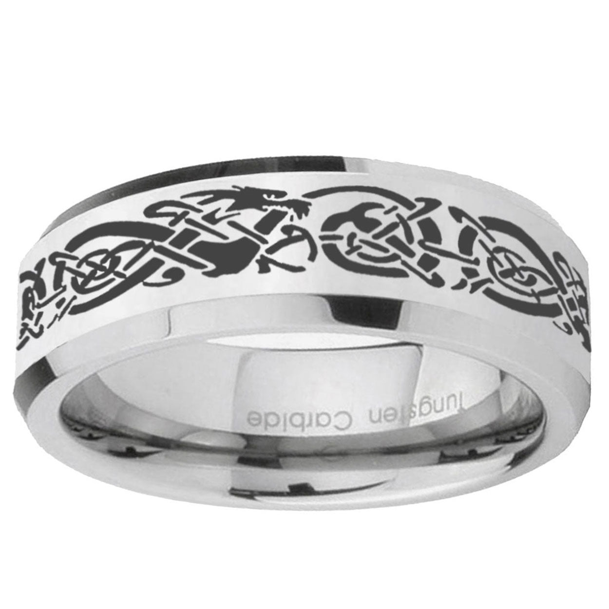 Personalize the 10mm Celtic Knot Dragon Beveled Edges Silver Tungsten Carbide Men's Ring. This silver tungsten ring with Celtic knot dragon design is perfect for custom engravings.