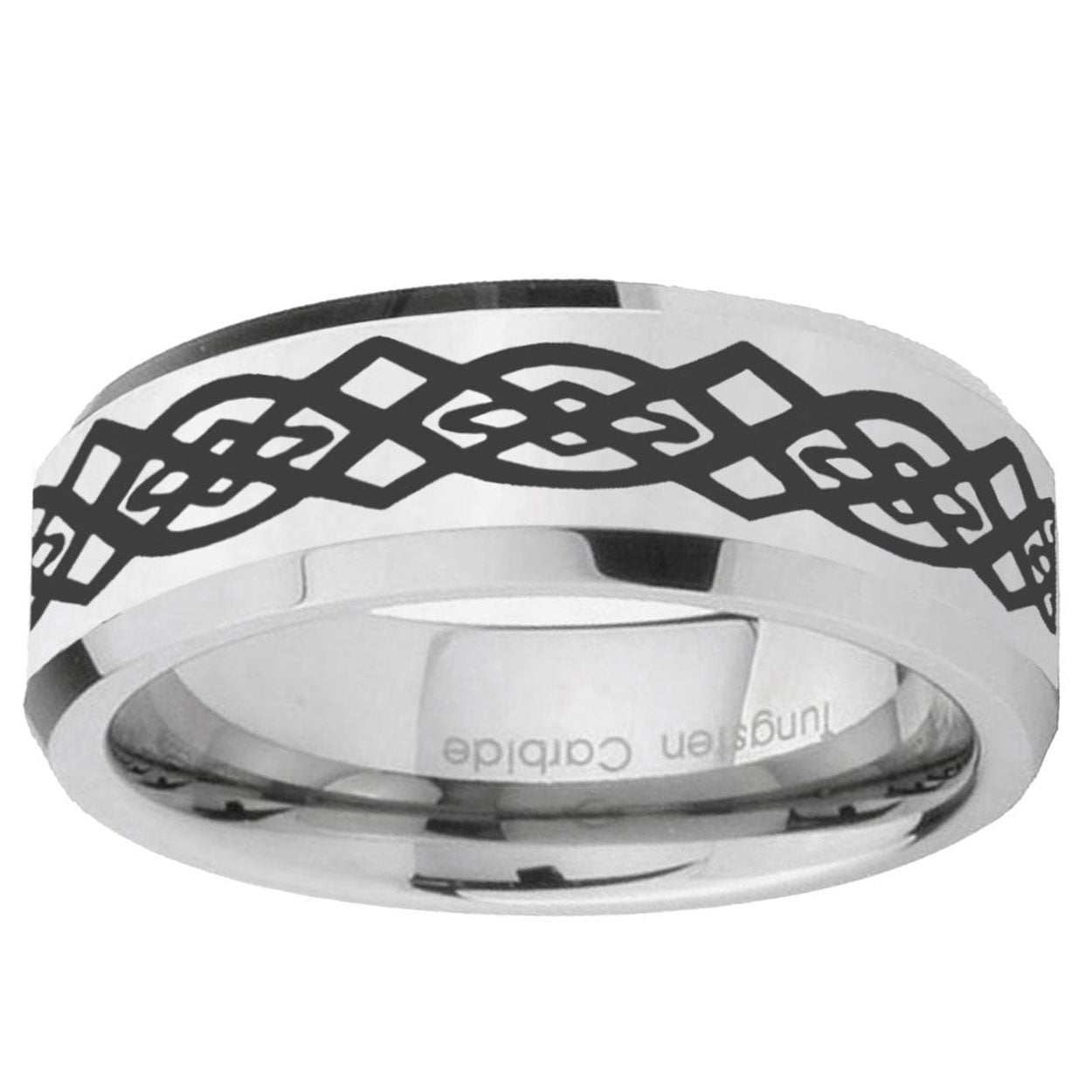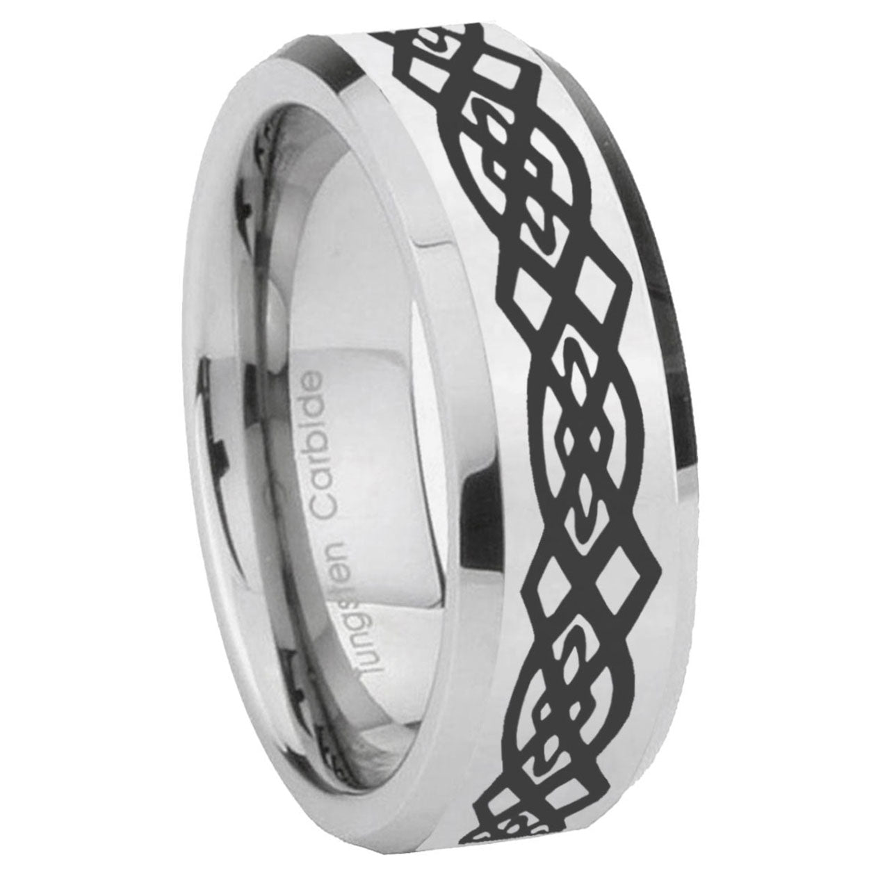 10mm Celtic Knot Beveled Edges Silver Tungsten Carbide Mens Ring Engraved