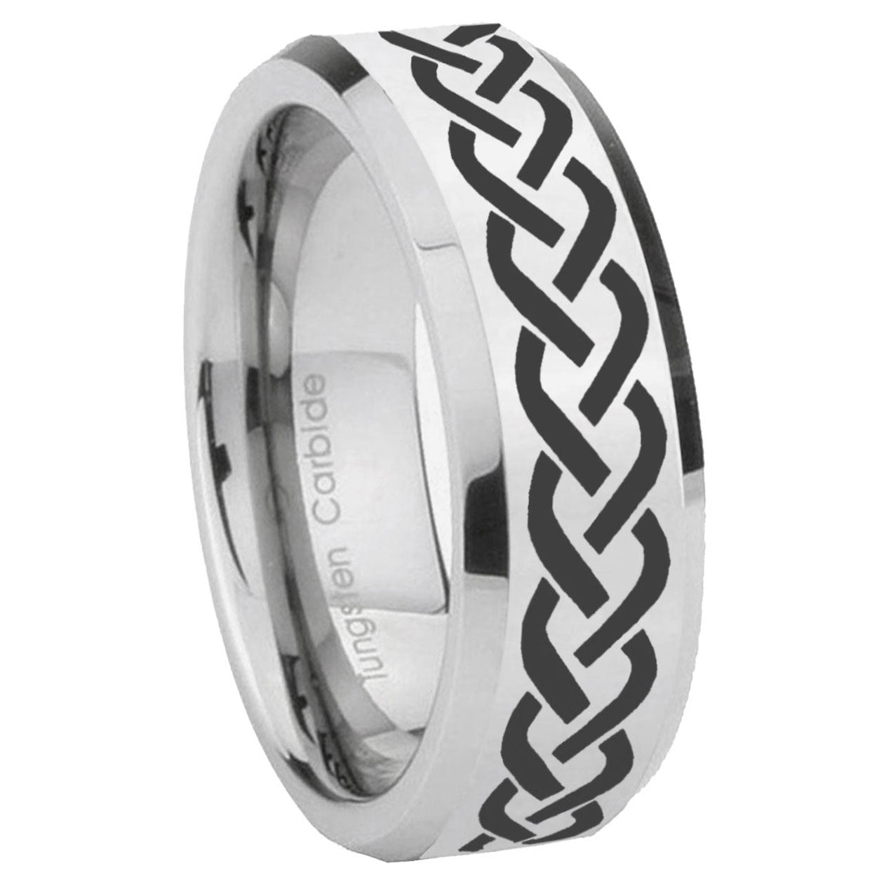 Personalize the 10mm Laser Celtic Knot Beveled Edges Silver Tungsten Carbide Mens Ring Engraved. This silver tungsten ring with Laser Celtic Knot design is perfect for custom engravings.