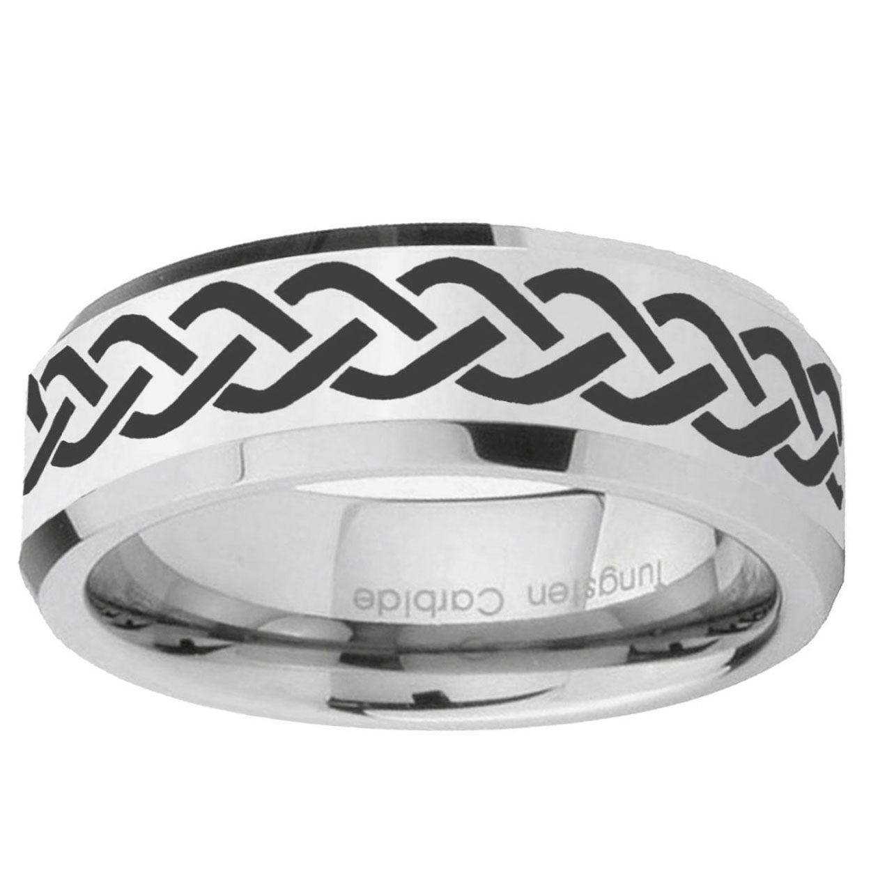 10mm Laser Celtic Knot Beveled Edges Silver Tungsten Carbide Mens Ring Engraved