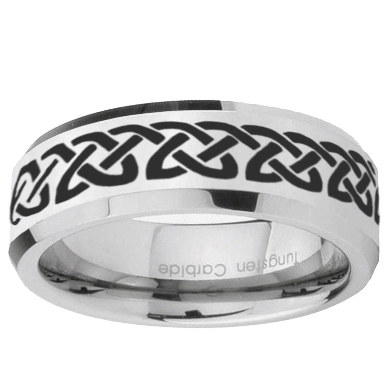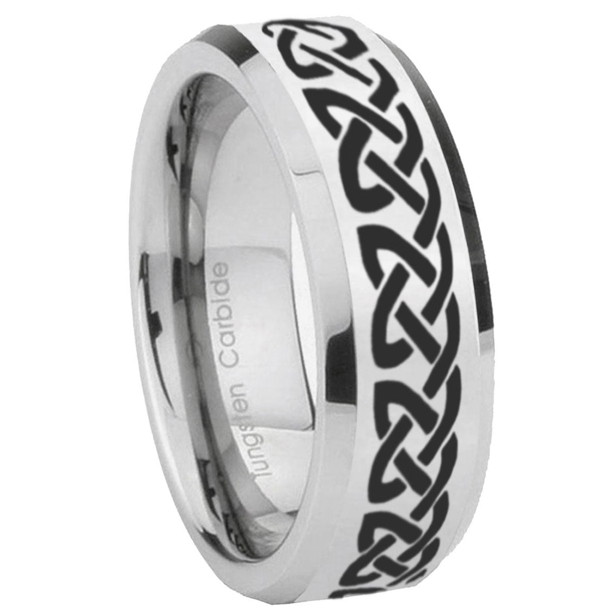 Personalize the 10mm Celtic Knot Love Beveled Edges Silver Tungsten Carbide Mens Ring Engraved. This silver tungsten ring with Celtic knot love design is perfect for custom engravings.