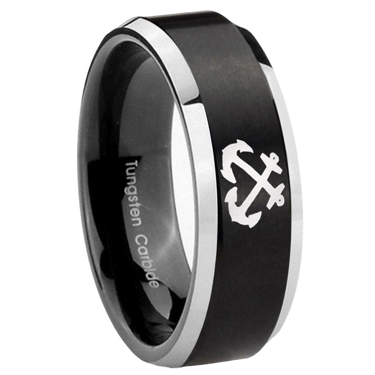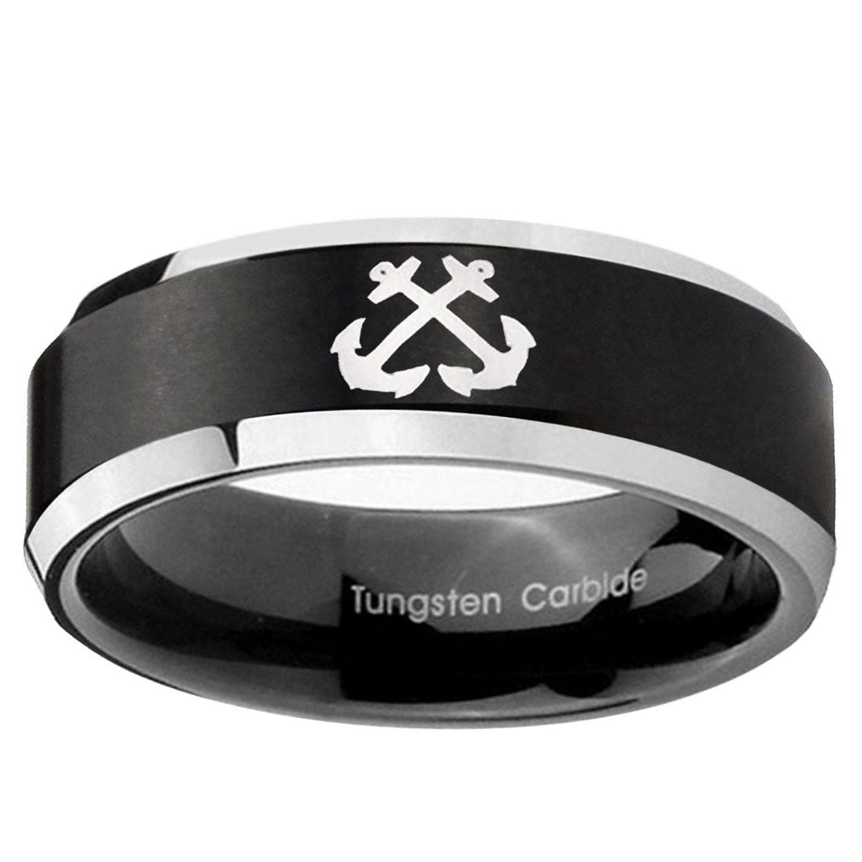 Intruding 5, 8mm Anchor Beveled Edges Brush Black 2 Tone Tungsten Carbide Mens Wedding Ring . Offer in both 5mm and 8mm band width brushed black plated 2 tone finished from size 4 to 14