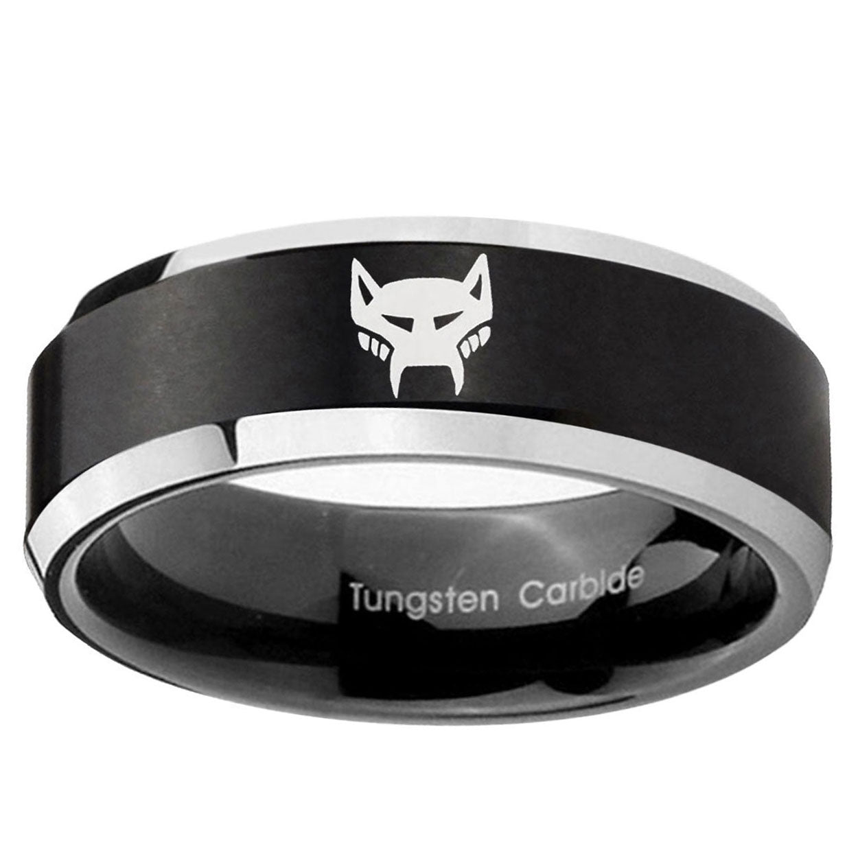 Intruding 5, 8mm Maximal Beveled Edges Brush Black 2 Tone Tungsten Mens Ring Engraved . Offer in both 5mm and 8mm band width brushed black plated 2 tone finished from size 4 to 14