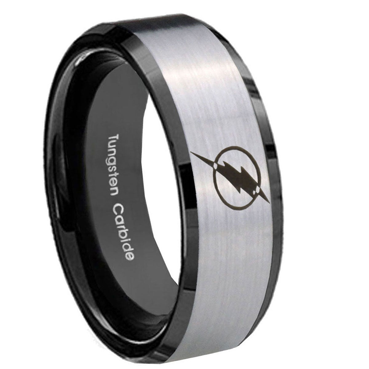 5, 8mm Flash Beveled Edge Black Silver Tungsten Metal Ring