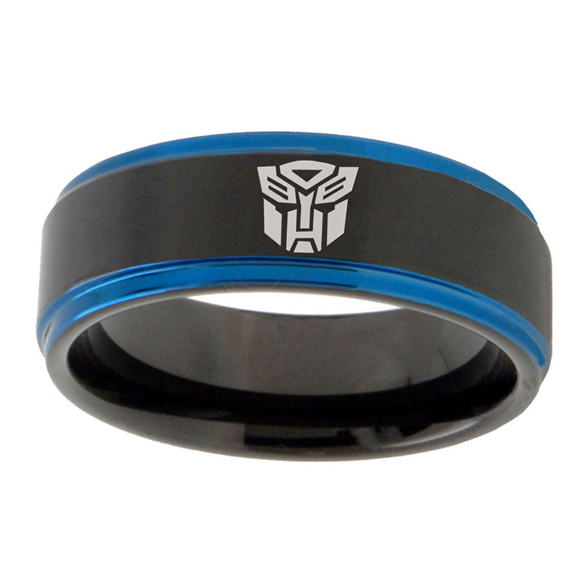 Introuding 5, 8mm Transformers Autobot Step Edge Black Blue Tungsten Wedding Ring . Offer in both 5mm and 8mm band width black and blue plated finished from size 4 to 14