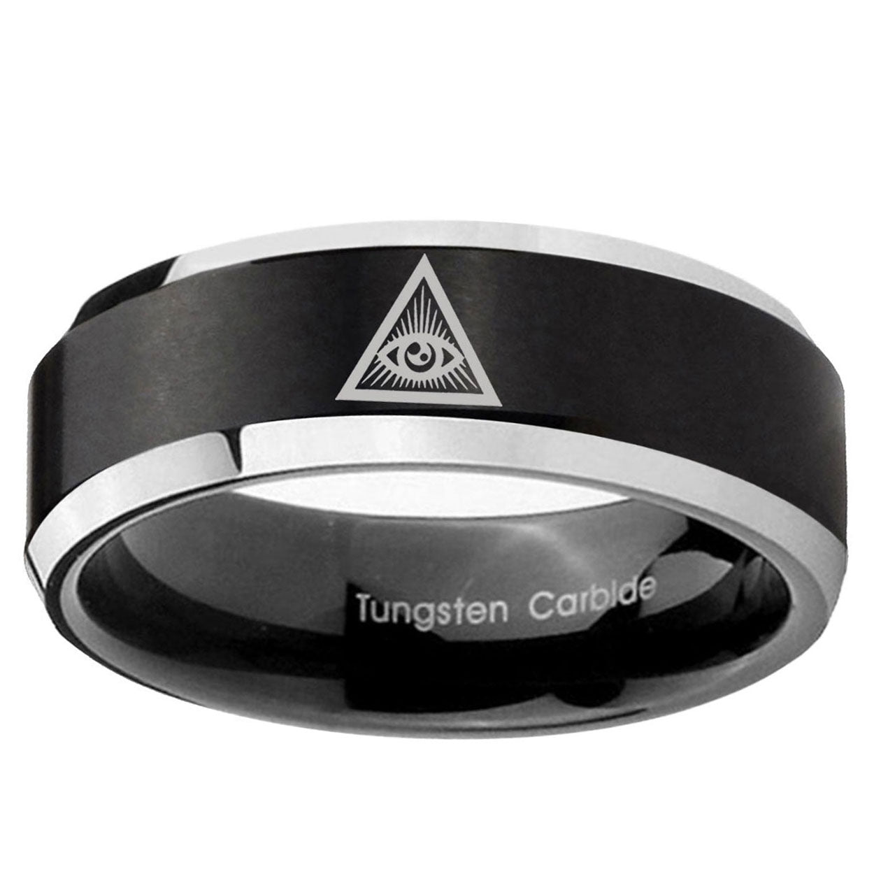 Intruding 5, 8mm Seeing Eye of God Beveled Edge Two Tone Black Men Ring Tungsten . Offer in both 5mm and 8mm band width black two tone finished from size 4 to 14