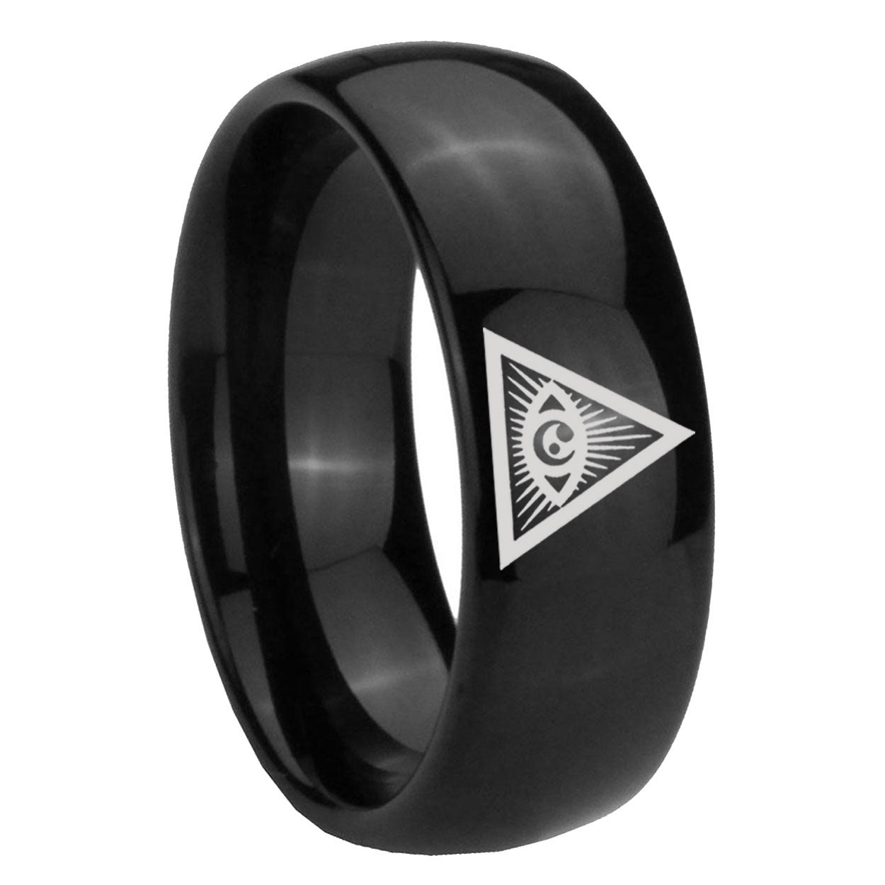 Intruding 5, 8mm Seeing Eye of God Dome Polish Black Tungsten Ring For Men . Offer in both 5mm and 8mm band width polished black plated finished from size 4 to 14