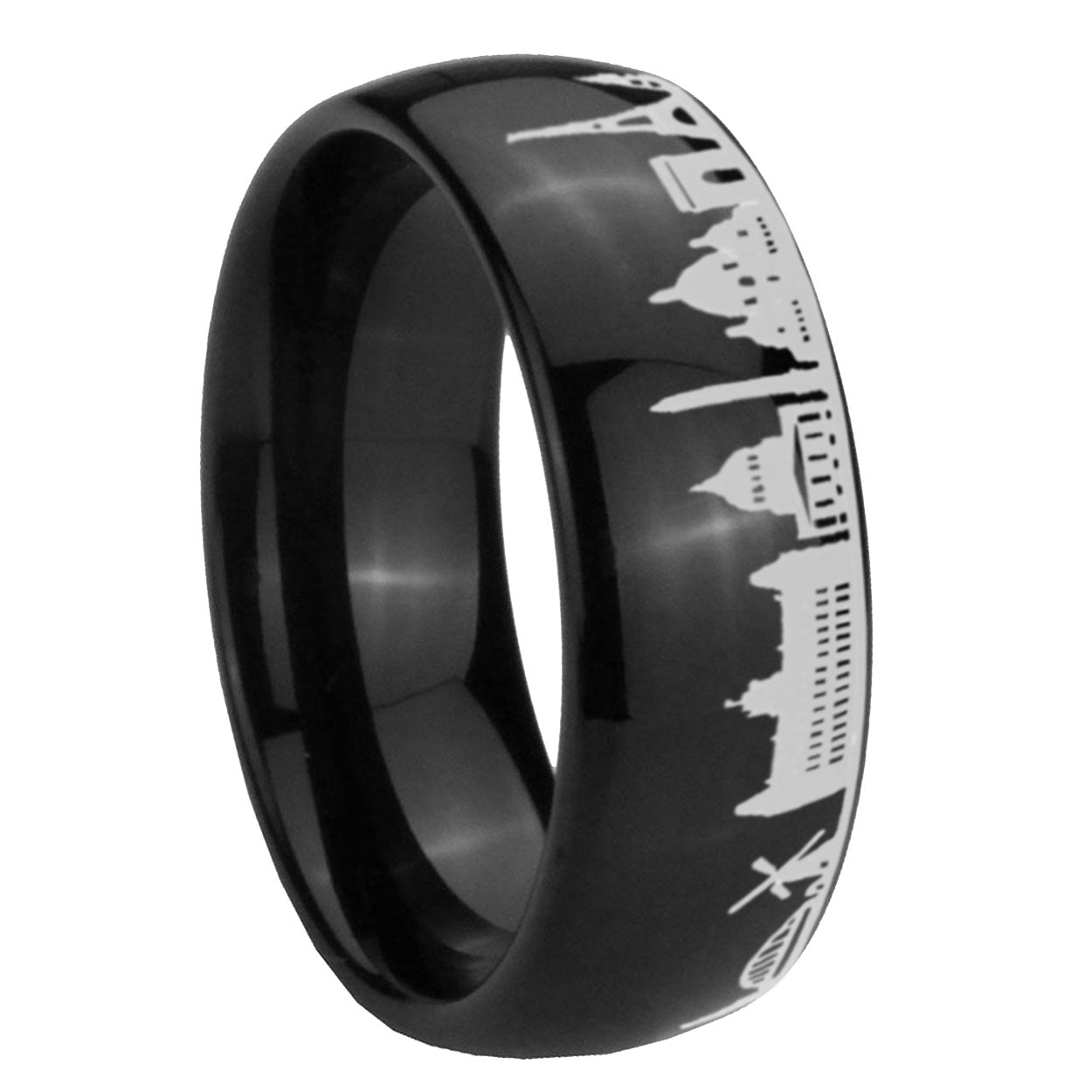 Intruding 8mm France Paris City Dome Polish Black Tungsten Mens Engraved Wedding Bands . Offer in 8mm band width polished black plated finished from size 7 to 14
