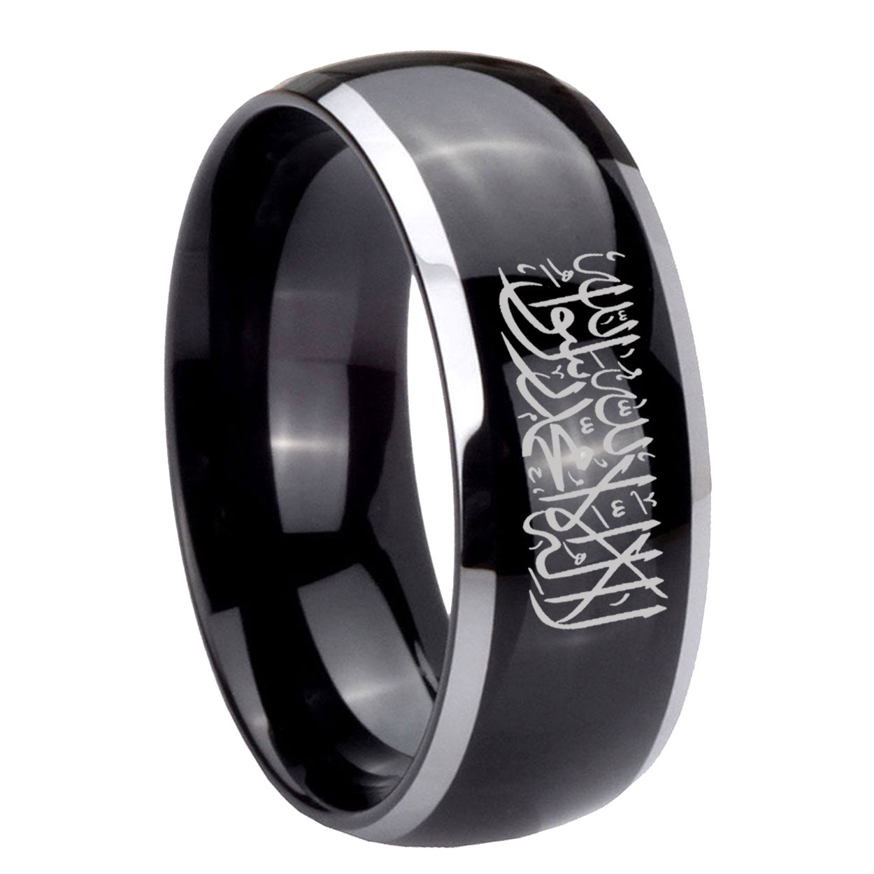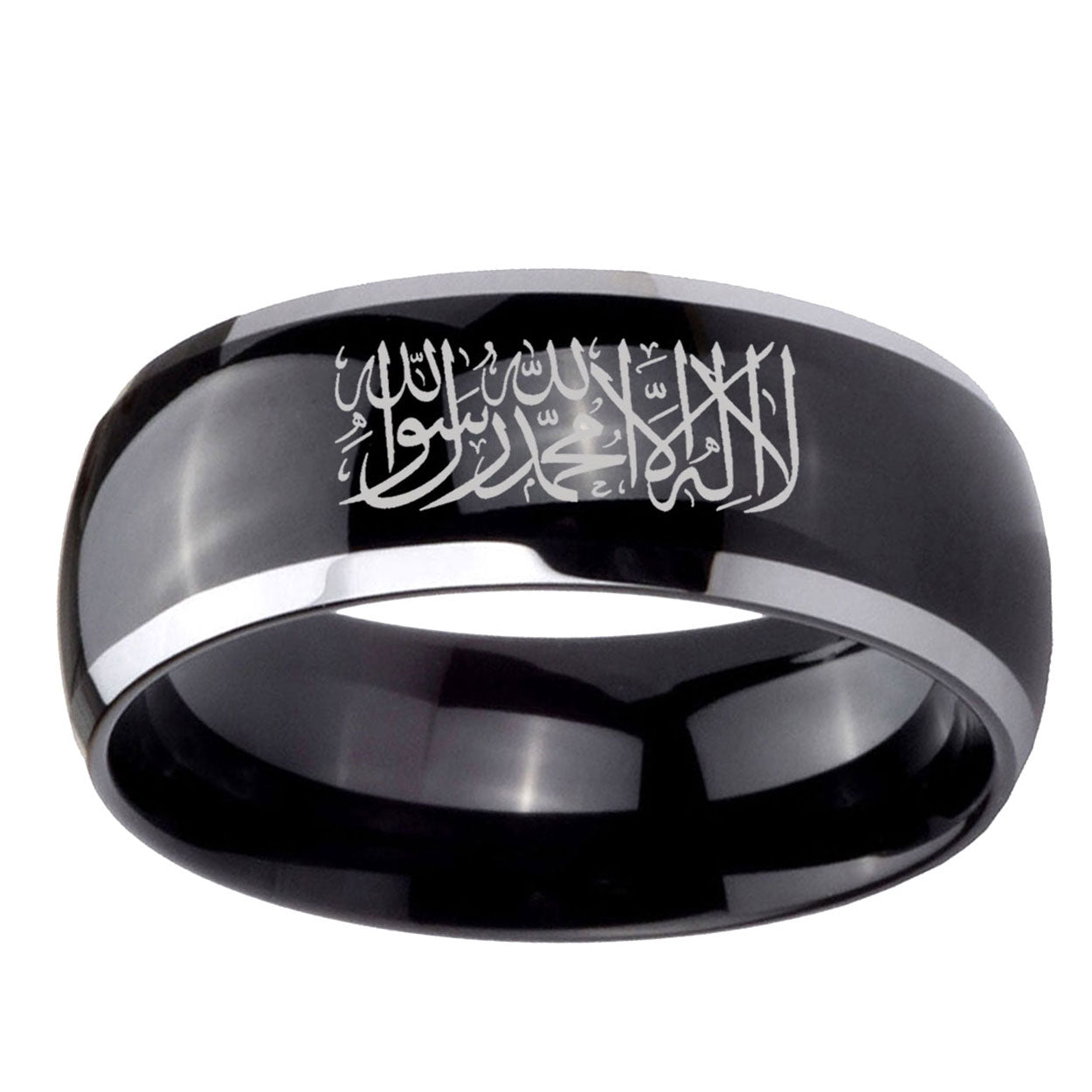 Intruding 5, 8mm Islamic Shahada Dome Two Tone Black Tungsten Carbide Ring . Offer in both 5mm and 8mm band width polished black plated two tone finished from size 4 to 14