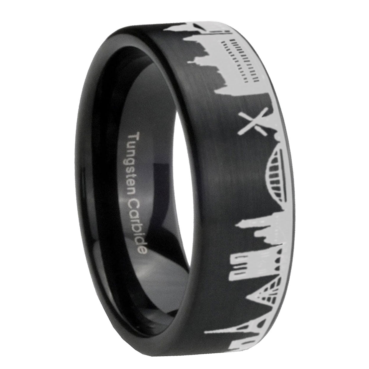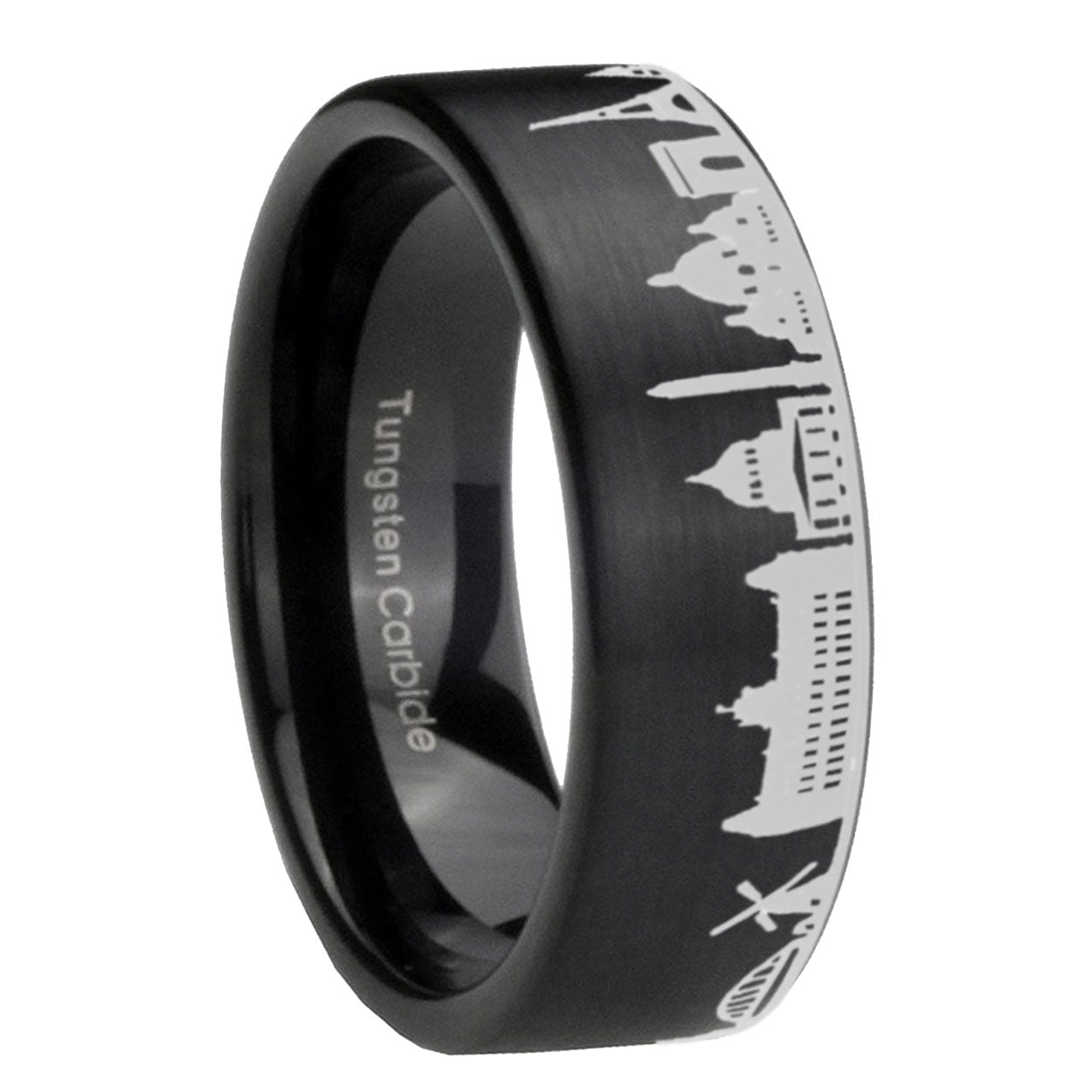 Intruding 8mm France Paris City Pipe Cut Brushed Black Tungsten Ring For Him . Offer in 8mm band width black plated finished from size 7 to 14