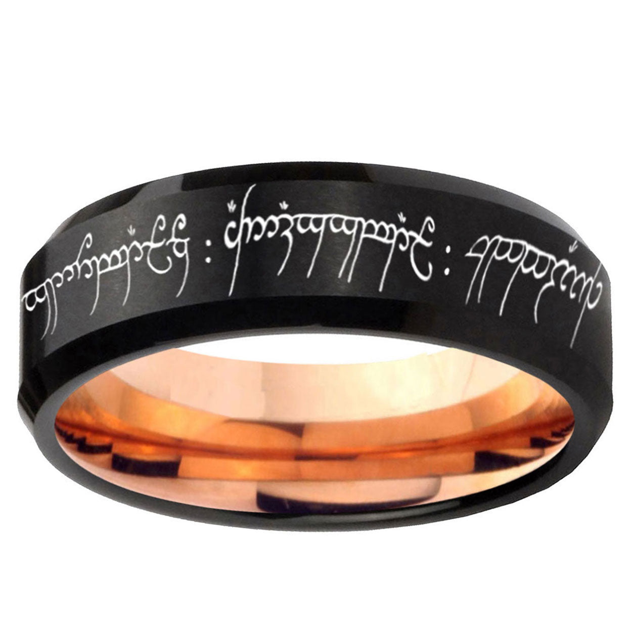 Intruding 5, 8mm Lord Of The Rings Beveled Edge Rose Gold Black Tungsten Mens Wedding Bands . Offer in both 5mm and 8mm band width black and rose gold plated finished from size 4 to 14