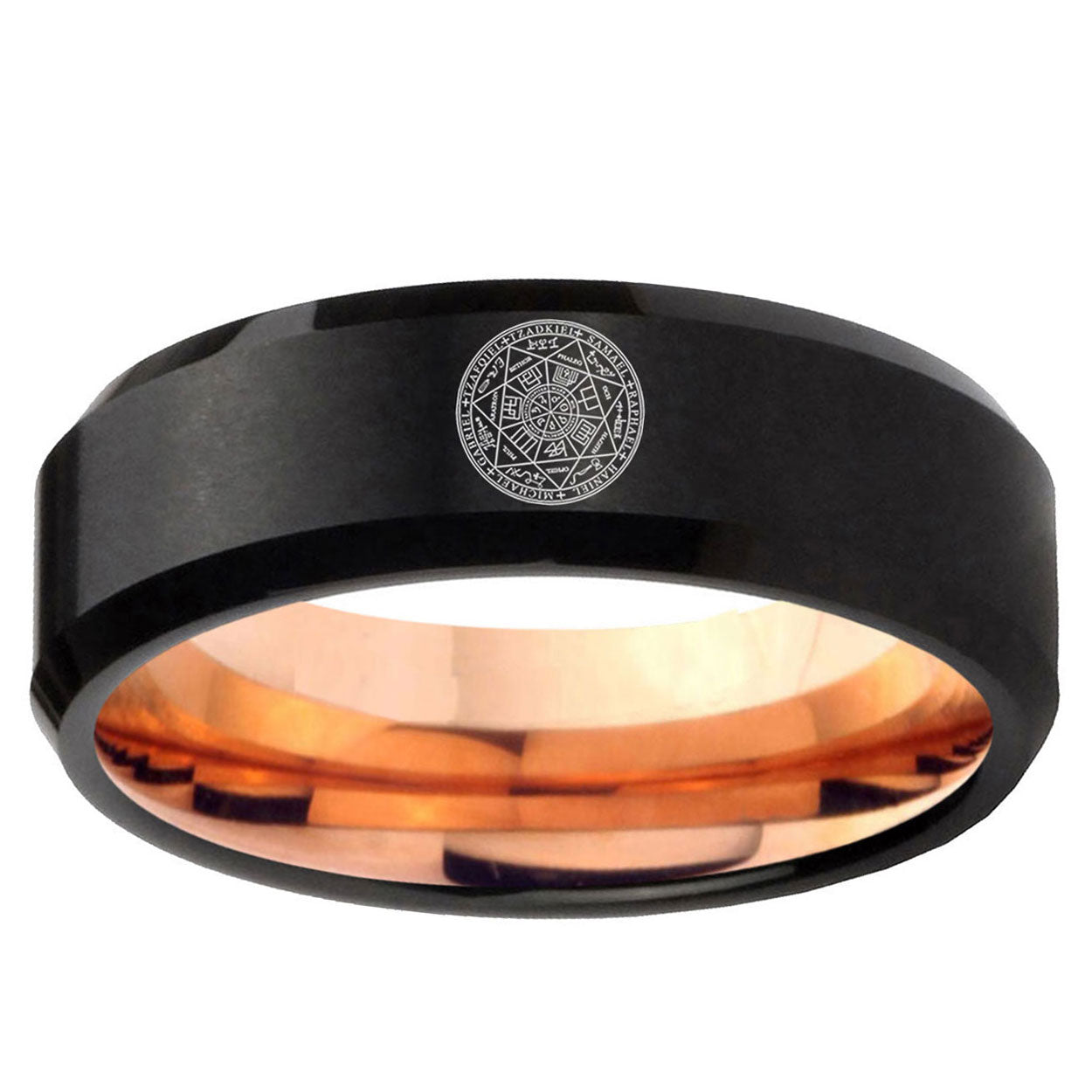 Intruding 5, 8mm Seal of Seven Archangel Beveled Edge Rose Gold and Black Finished Men's Rings Tungsten . Offer in both 5mm and 8mm band width Rose Gold and Black finished from Size 4 to 14