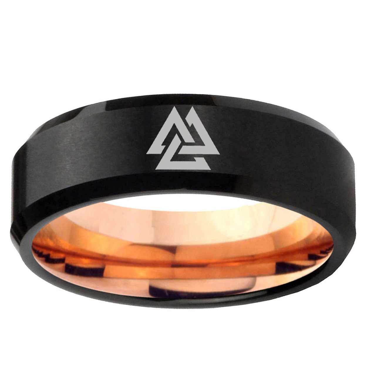 Intruding 5, 8mm Viking Symbol Beveled Edge Rose Gold and Black Finished Men's Rings Tungsten . Offer in both 5mm and 8mm band width Rose Gold and Black finished from Size 4 to 14