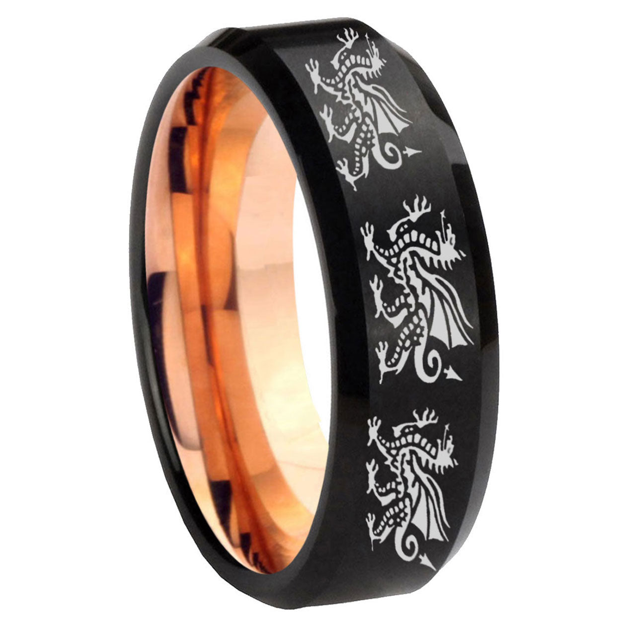 Intruding 5, 8mm Multiple Dragon Beveled Edge Rose Gold and Black Tungsten Anniversary Ring . Offer in both 5mm and 8mm band width Rose Gold and Black finished from Size 4 to 14