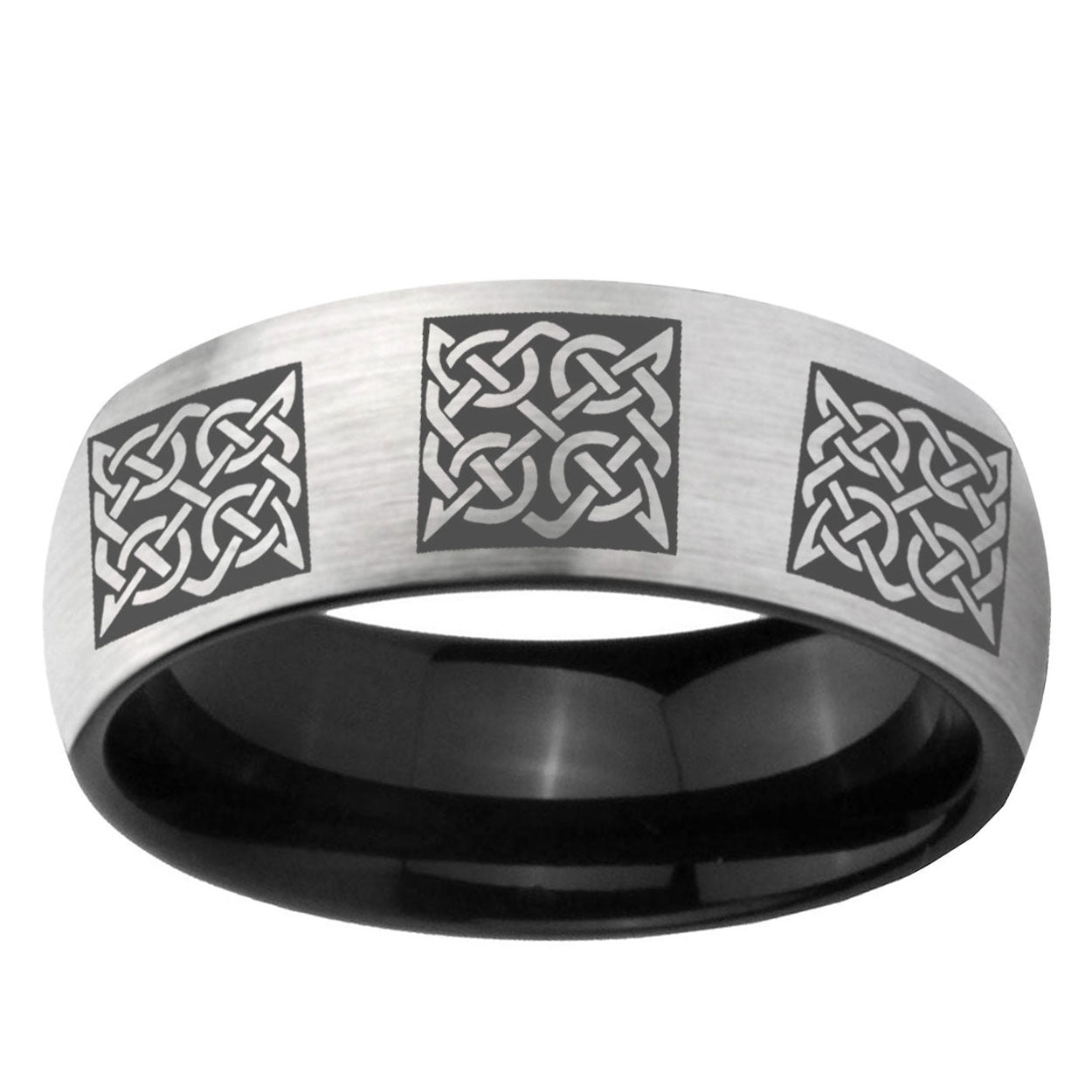 Intruding 6, 8mm Multiple Celtic Dome Gray And Black Tungsten Carbide Men's Promise Rings . Offer in both 6mm and 8mm band width Gray And Black plated finished from size 5 to 14