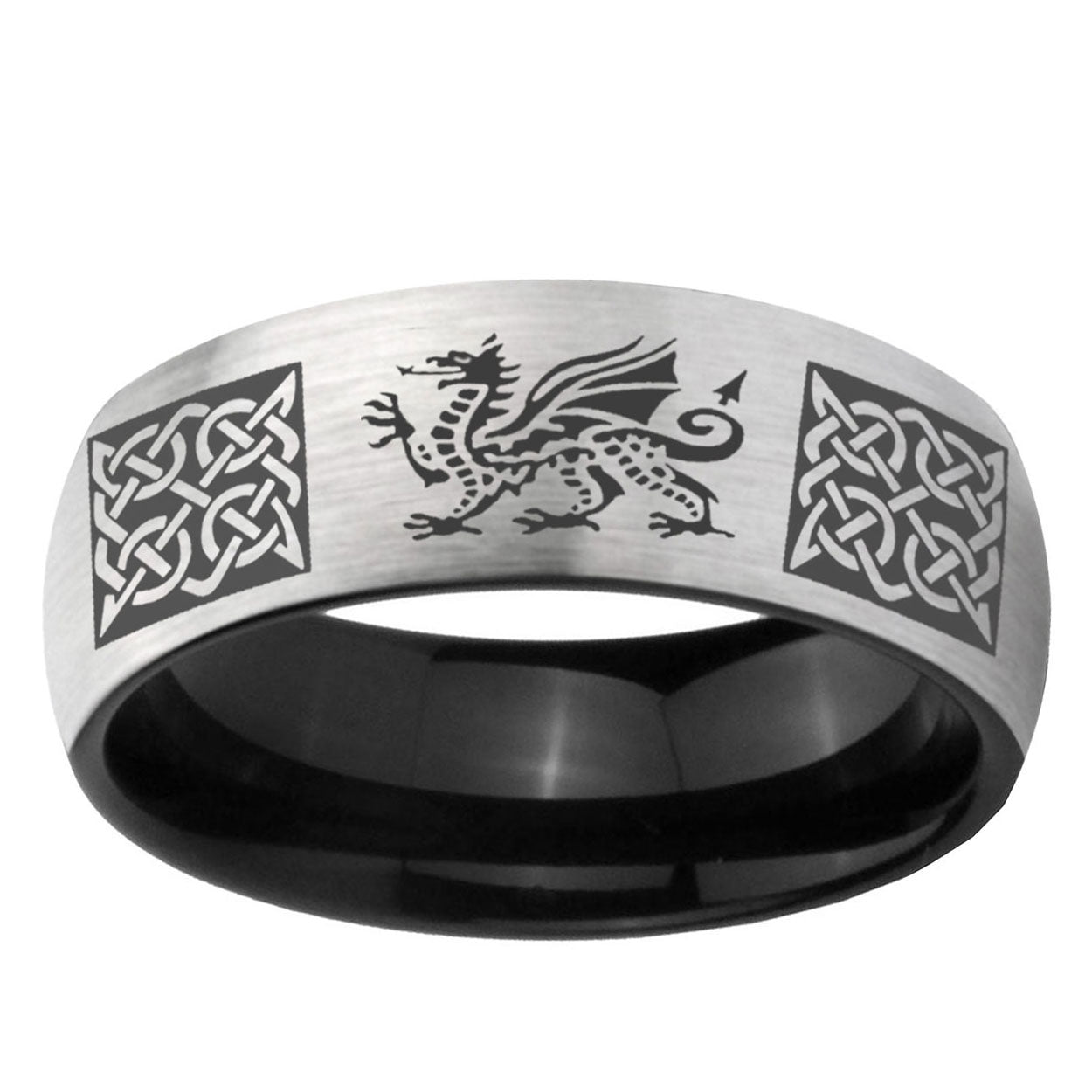 Intruding 6, 8mm Multiple Dragon Celtic Dome Gray And Black Tungsten Carbide Wedding Band Ring . Offer in both 6mm and 8mm band width Gray And Black plated finished from size 5 to 14