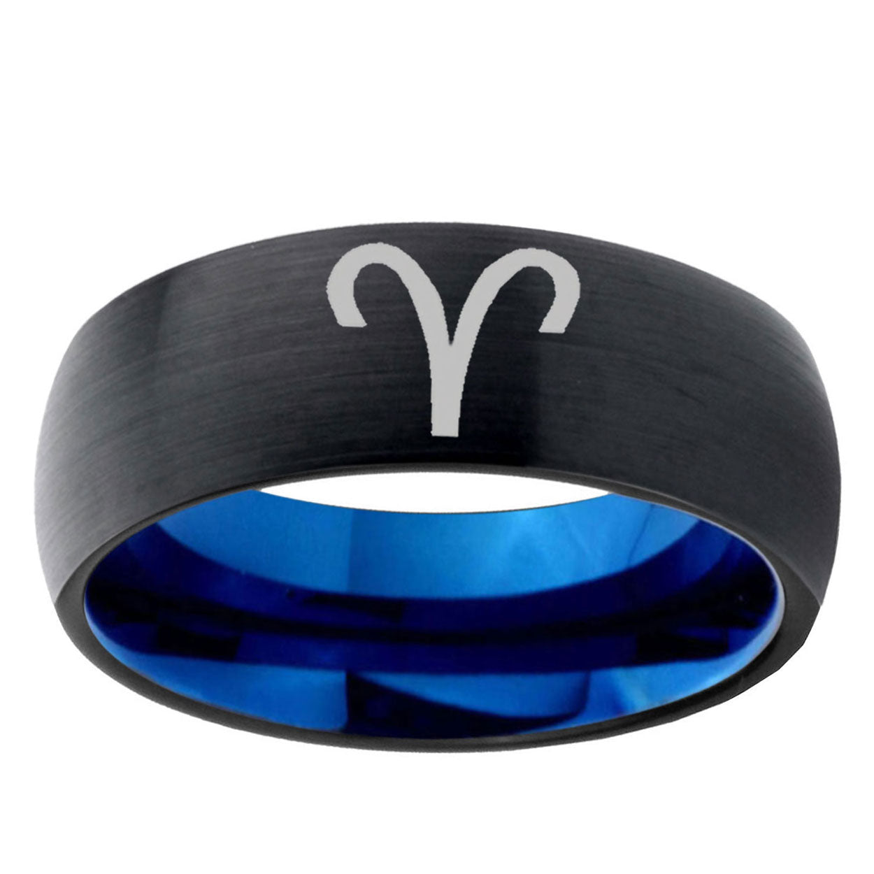 Intruding 5, 8mm Aries Zodiac Dome Black And Blue Tungsten Carbide Anniversary Ring . Offer in both 5mm and 8mm band width black and blue plated finished from size 4 to 14