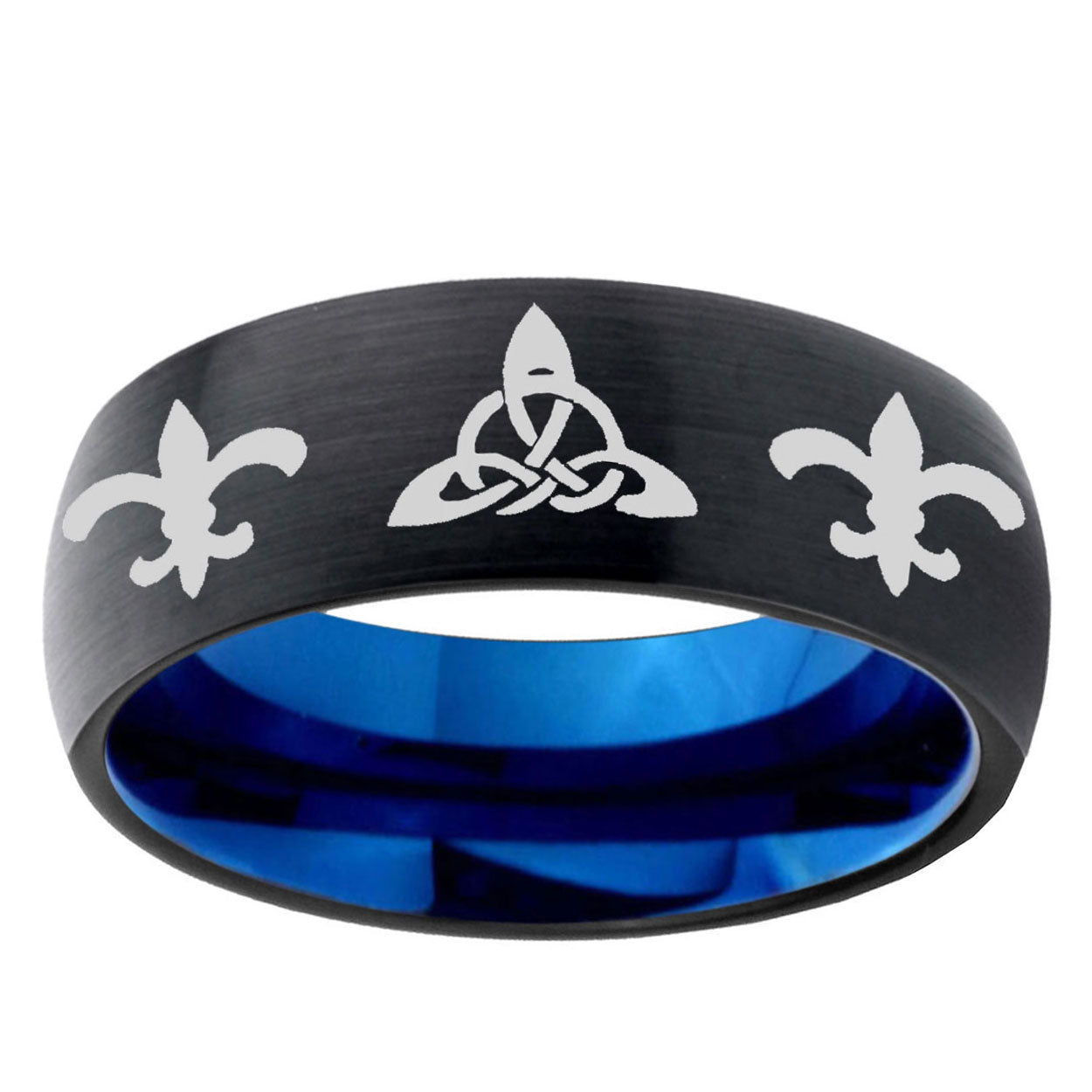 5, 8mm Celtic Triangle Fleur-De-Lis Dome Black And Blue Tungsten Carbide Men's Bands Ring